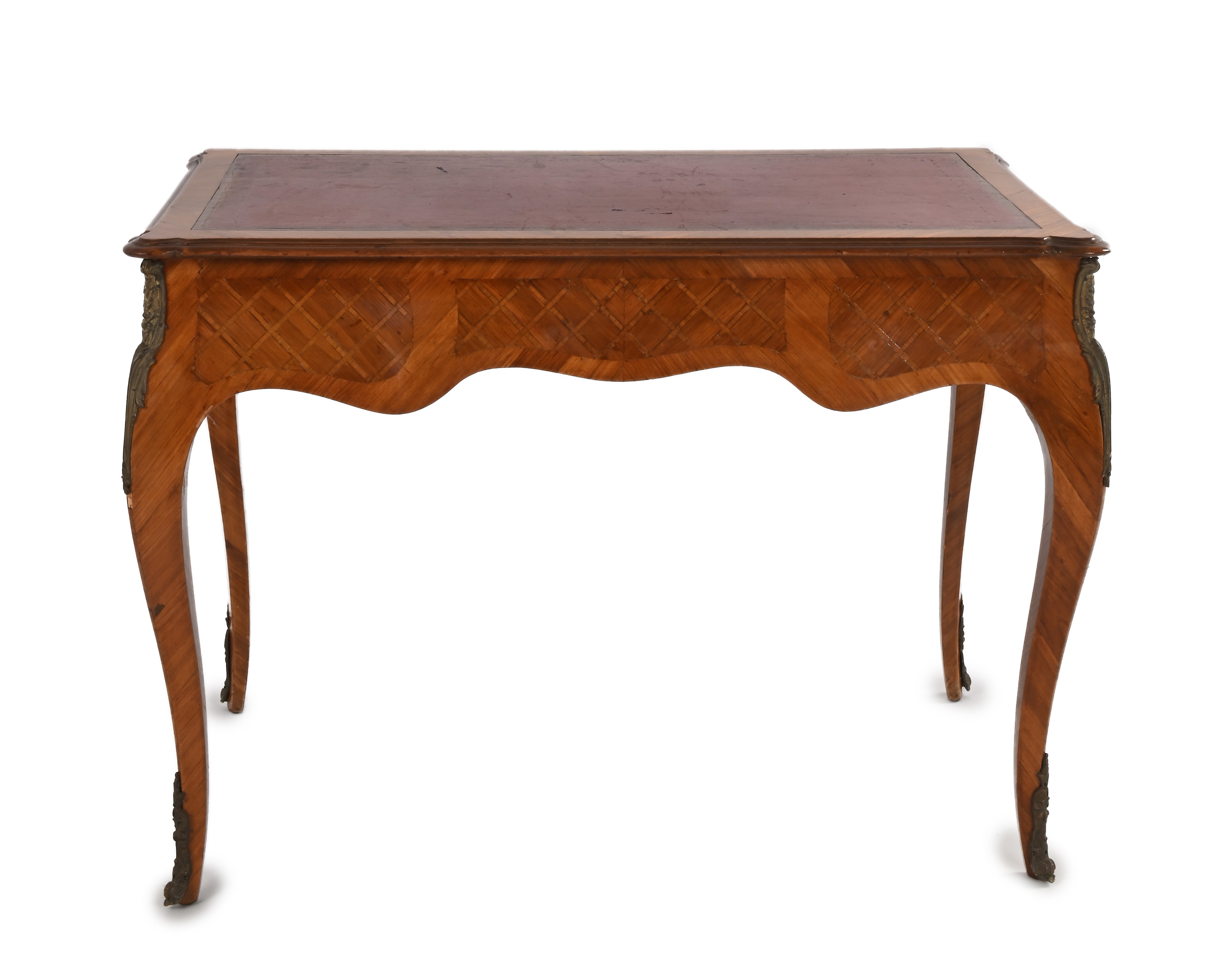 Scrivania da centro a marqueterie geometrica con finiture ornamentali in bronzo dorato, Francia, XX secolo
