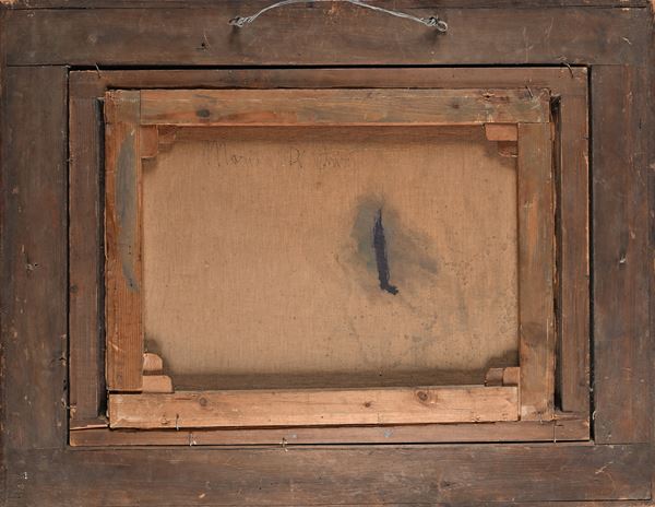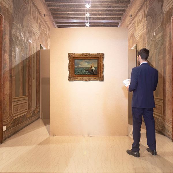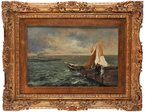 Questa suggestiva scena marina rappresenta l'approccio di Mosè Bianchi alla pittura di paesaggio, con un focus particolare sulle atmosfere marine. In primo piano si vede una barca a vela con alcune figure che sembrano pronte a salpare, mentre sullo sfondo si distingue il mare agitato e una nave a vapore, creando un contrasto visivo tra tradizione e modernità. Il cielo, dipinto con toni plumbei e crepuscolari, suggerisce l'imminenza di un cambiamento meteorologico, dando all'opera una dinamica drammaticità tipica delle sue marine.