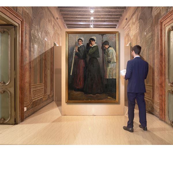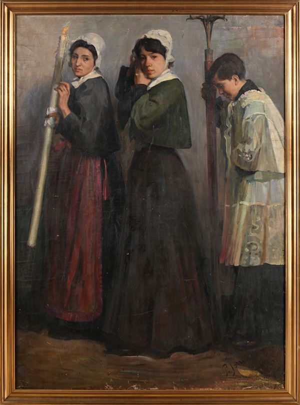 Tipica della produzione di Joris a ridosso del Novecento è la pennella sciolta e corposa e la resa sapiente dei contrasti cromatici, evidente nelle ricche sfumature di rosso e nero degli abiti delle figure femminili e nel raffinatissimo uso del bianco nella veste del chierichetto sulla sinistra. Il formato e le dimensioni permettono di ipotizzare che il dipinto sia stato realizzato in vista di una pubblica esposizione. Sul retro della tela è abbozzato un profilo di Garibaldi.
