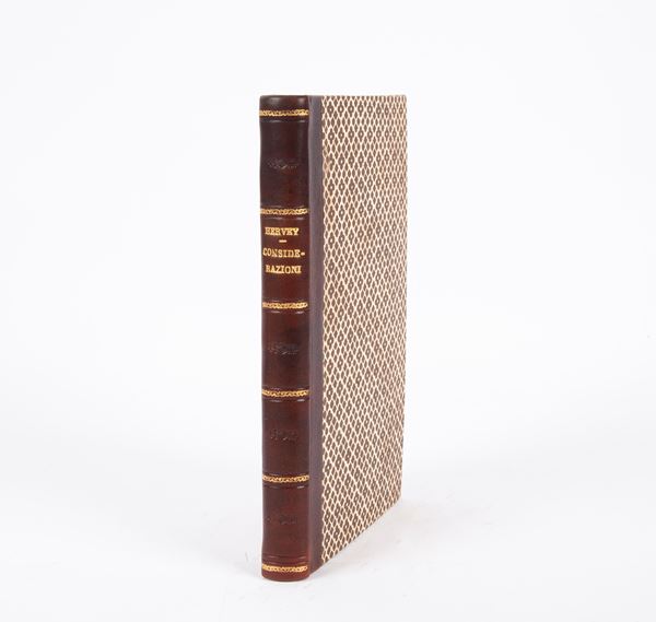 In 8°. Bella edizione delle considerazioni dello Hervey messe in prosa italiana con alcune poesie tratte dallo Sturm, oltre a queste cantici ed idilli, ottave ed inni al Creatore e l'anacreontica sulla grandezza di Dio formata da 5 prose di sobria grandezza. Legatura in mezza pelle moderna. Conservate le copertine originali in brossura.
