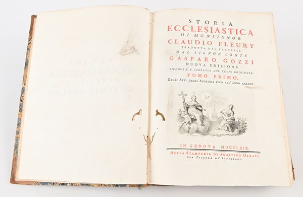 In 4°. Celeberrima e per certi versi insuperata opera storica, non comune a reperirsi completa di tutti i volumi. Il Corpus dell'opera è composto da 26 volumi cui fa seguito la Continuazione della Storia Ecclesiastica e un volume diviso in due parti intitolato Giustificazione de' discorsi e della Storia ecclesiastica, Antonio Cervone, Napoli 1781, per un totale di 28 volumi. Lavori di tarlo al primo volume che non ledono il testo. Legatura in mezza pelle coeva con titoli su tasselli e fregi in oro ai dorsi.