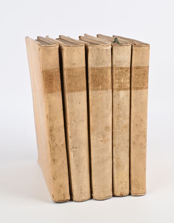 5 Tomi in 4°. Opera illustrata con antiporta figurata e numerose incisioni a piena pagina nel testo e fuori testo, seconda edizione riveduta ed aumentata della fortunata biografia ciceroniana scritta dal custode della biblioteca di Cambridge ed oppositore del Bentley. Presente anche il quinto volume: Lettere di M.T. Cicerone a M. Bruto e di Bruto a Cicerone. Legatura coeva in piena pergamena con titoli su tassello in oro ai dorsi.