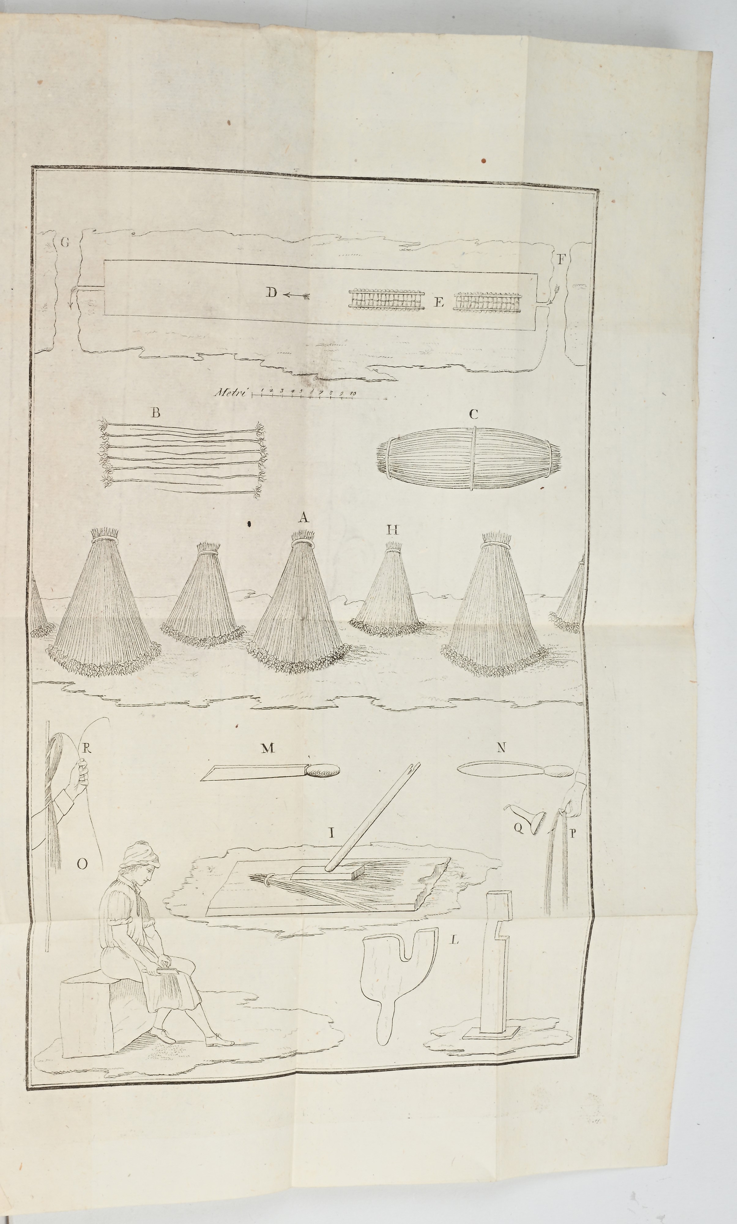 In 12° Con tavola incisa più volte ripiegata in fine. Opuscolo stampato in numerose edizioni su iniziativa del Governo Napoleonico (Camere di Commercio dipartimentali) che riprende sostanzialmente l'articolo pubblicato nello stesso anno Morosi sul Giornale della Società d'incoraggiamento delle scienze e delle arti stabilita in Milano. L'autore era stato incaricato di occuparsi della lavorazione del lino nel suo viaggio nell'Europa centro-settentrionale durante il 1807-1807 dove aveva appreso le tecniche utilizzate nelle Fiandre. Legatura in velina coeva.
