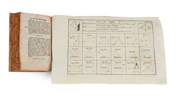 In 8o. Illustrato da 10 tavole fuori testo ripiegate più volte. Prima rara edizione di questo trattato di introduzione alla geometria dell'astronomo, gesuita, matematico e ingegnere idraulico trapanese che insegnò Siena e Firenze dove nel 1761 ottenne la cattedra di geografia. Si tratta di una chiara ed aggiornata esposizione delle proposizioni euclidee illustrate tuttavia con esempi pratici tenenti conto le ultime scoperte scientifiche. Legatura coeva in pergamena coeva con titolo in oro e manoscritto al dorso.