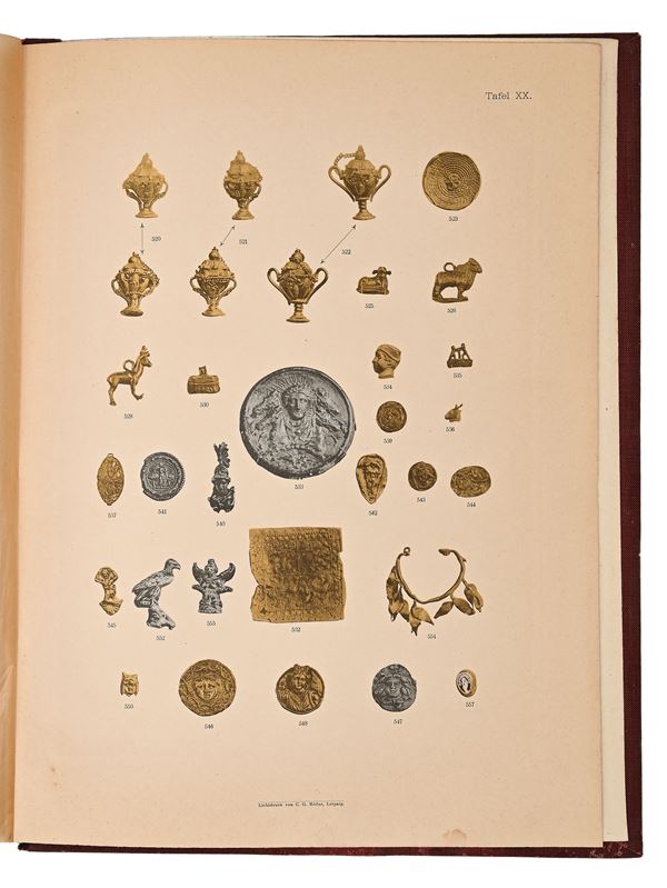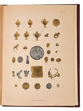 In folio. Con 20 litografie a colori a piena pagina protette da veline e 37 illustrazioni nel testo. Importante catalogo illustrato di oreficeria romana e preromana. Legatura originale in percallina con titoli e medaglione a rilievo in oro sul piatto e titoli e fregio impressi in oro al dorso.
