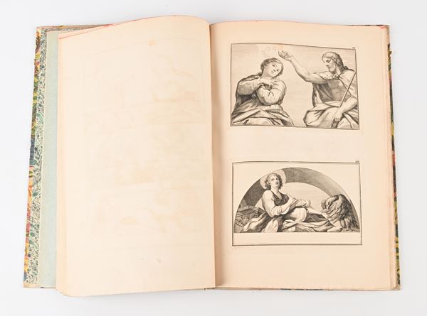 In 4° 59 incisioni per lo più a piena pagina raffiguranti capolavori della pittura per lo più di artisti emiliani presenti nel territorio parmense. Brossure editoriali conservate. Legatura coeva novecentesca in mezza pergamena con titolo su tassello in pelle al dorso.
