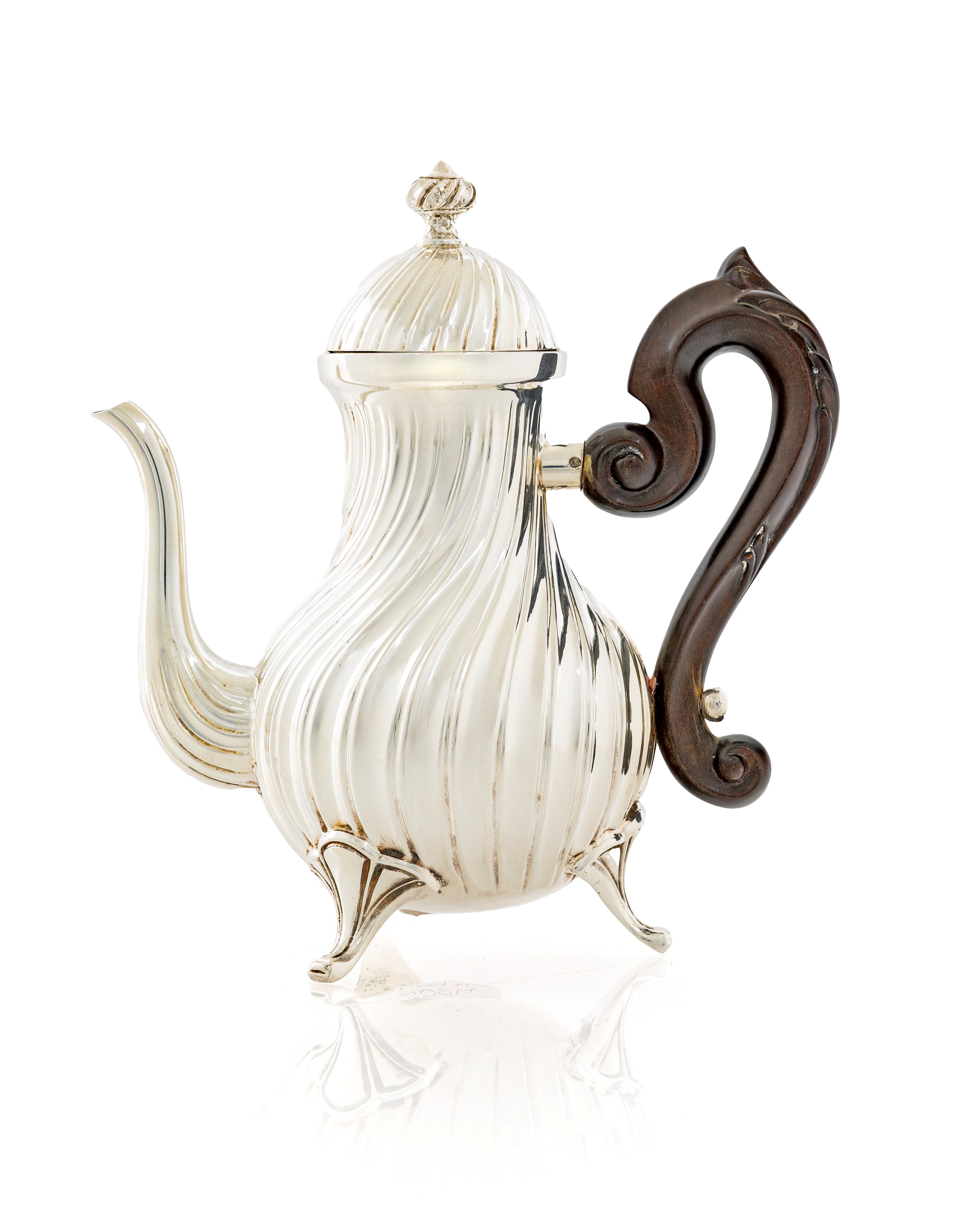 con versatoio sagomato, coperchio a cupolino incernierato con apertura laterale, manico incurvato in legno ebanizzato con estremità a ricciolo, piedi sfuggenti