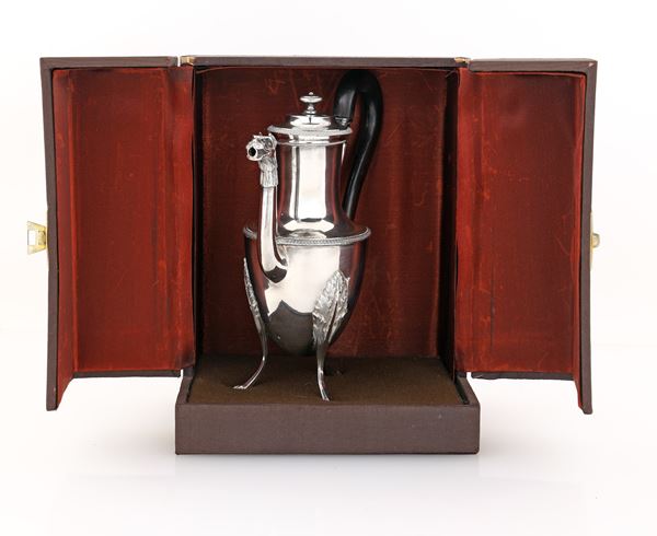 corpo ad anfora sorretto da tre gambe ferine con attacco a palmetta, versatoio sagomato con beccuccio cesellato in forma di testa ferina, coperchio incernierato con profilo guillochées e pomolo a trottola. Entro astuccio rivestito in tessuto moiré bruno