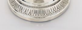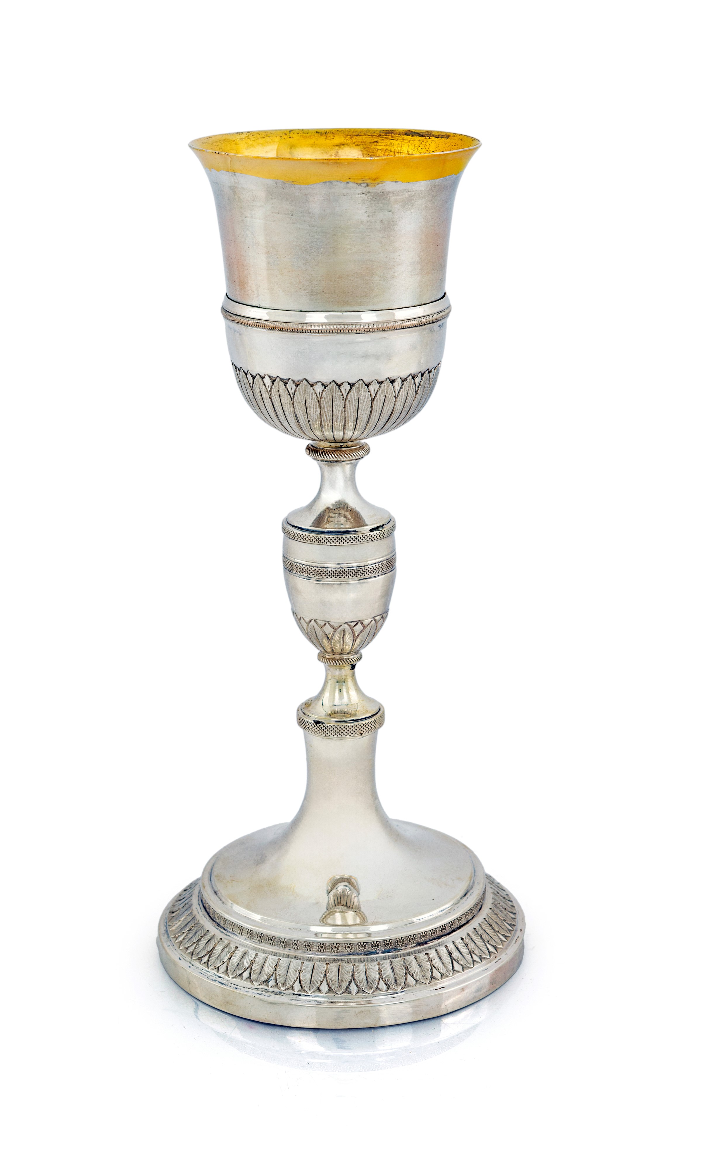 coppa con interno dorato con parte inferiore caratterizzata da lunghe foglie lanceolate; sostegno a vaso su piede circolare