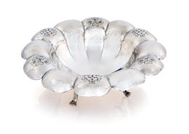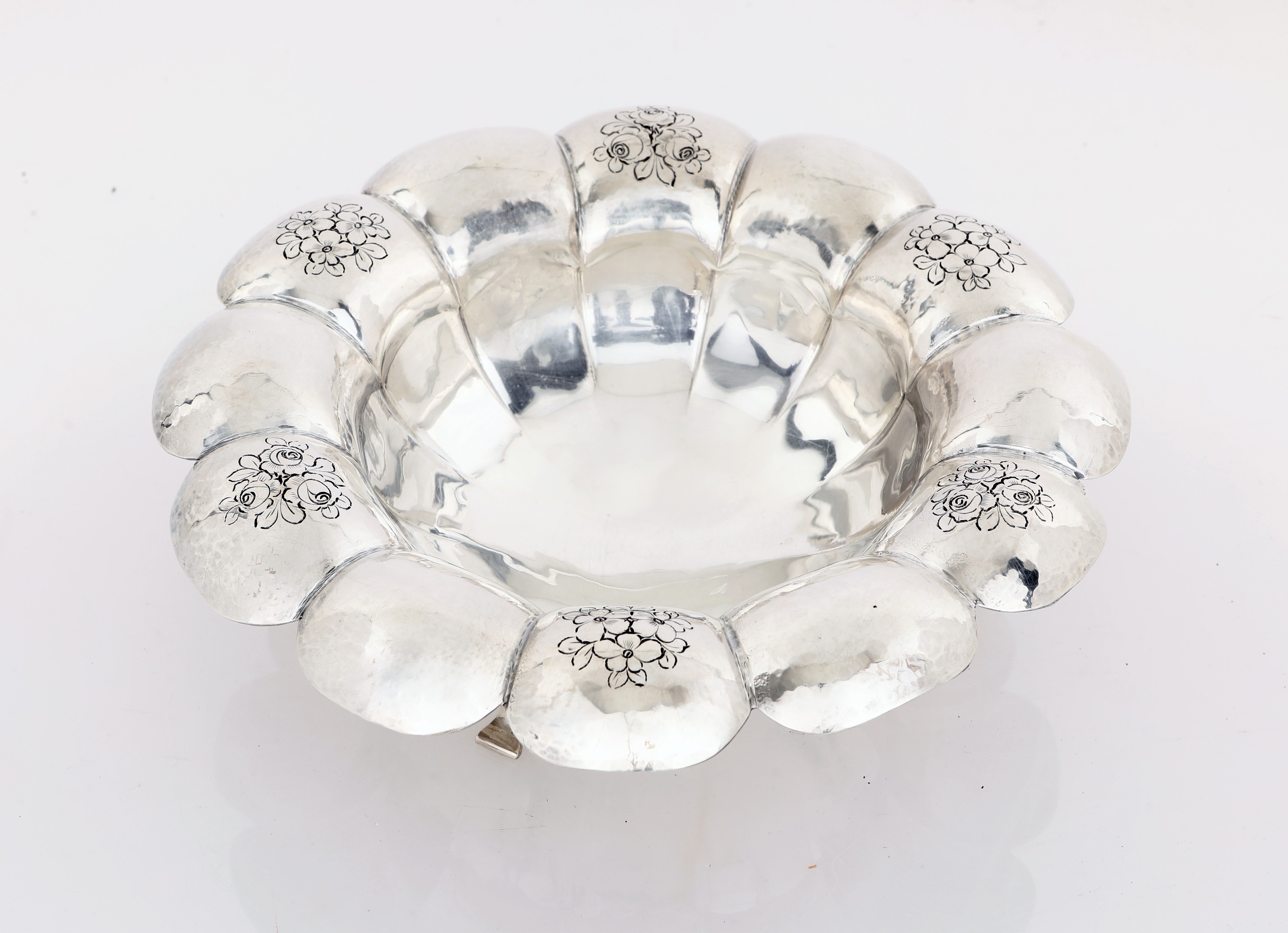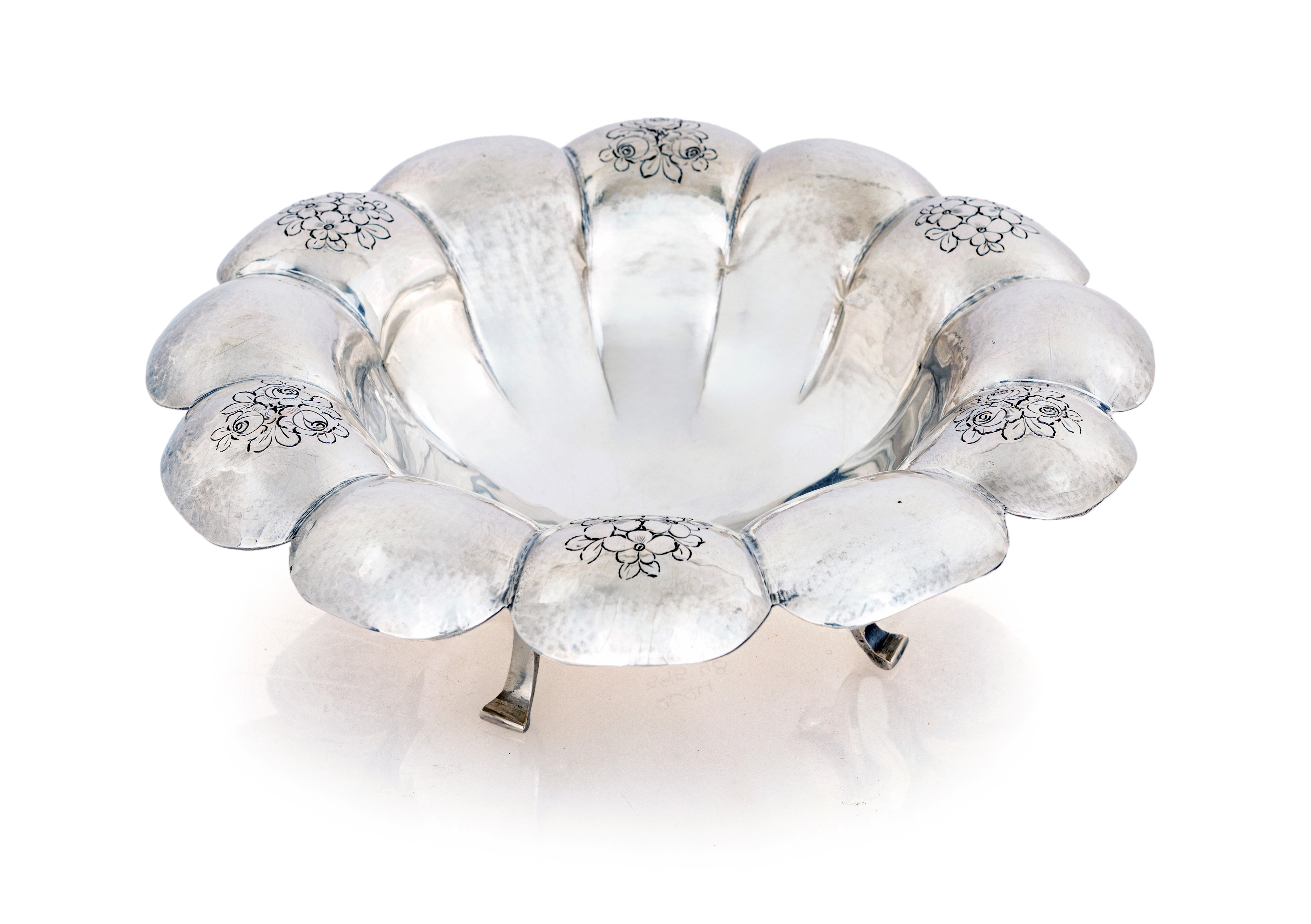 Centrotavola a forma di corolla con petali incurvati e fiori incisi alternati