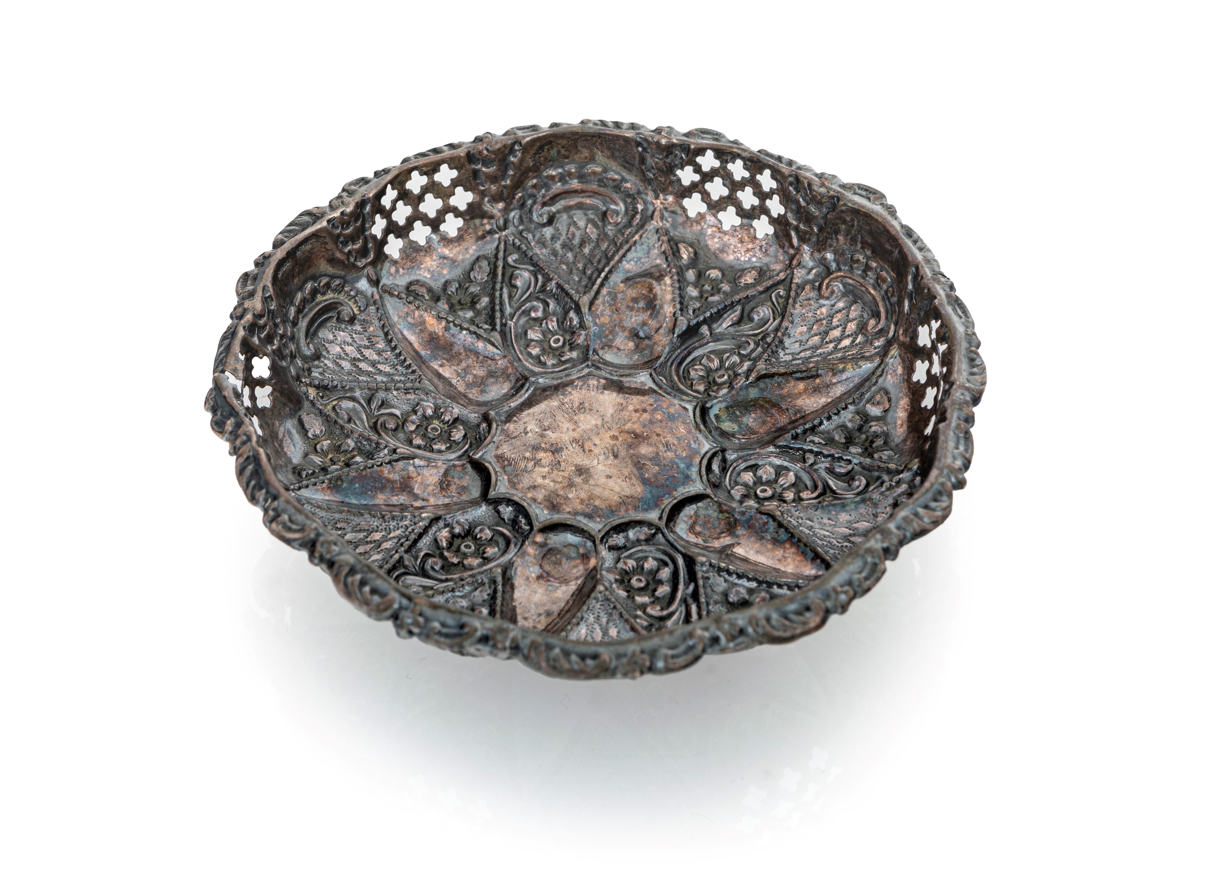 al centro una corolla con dedica incisa datata 1909 e petali lanceolati con fiori e girali vegetali a sbalzo; orlo centinato, tre piedini a sfera