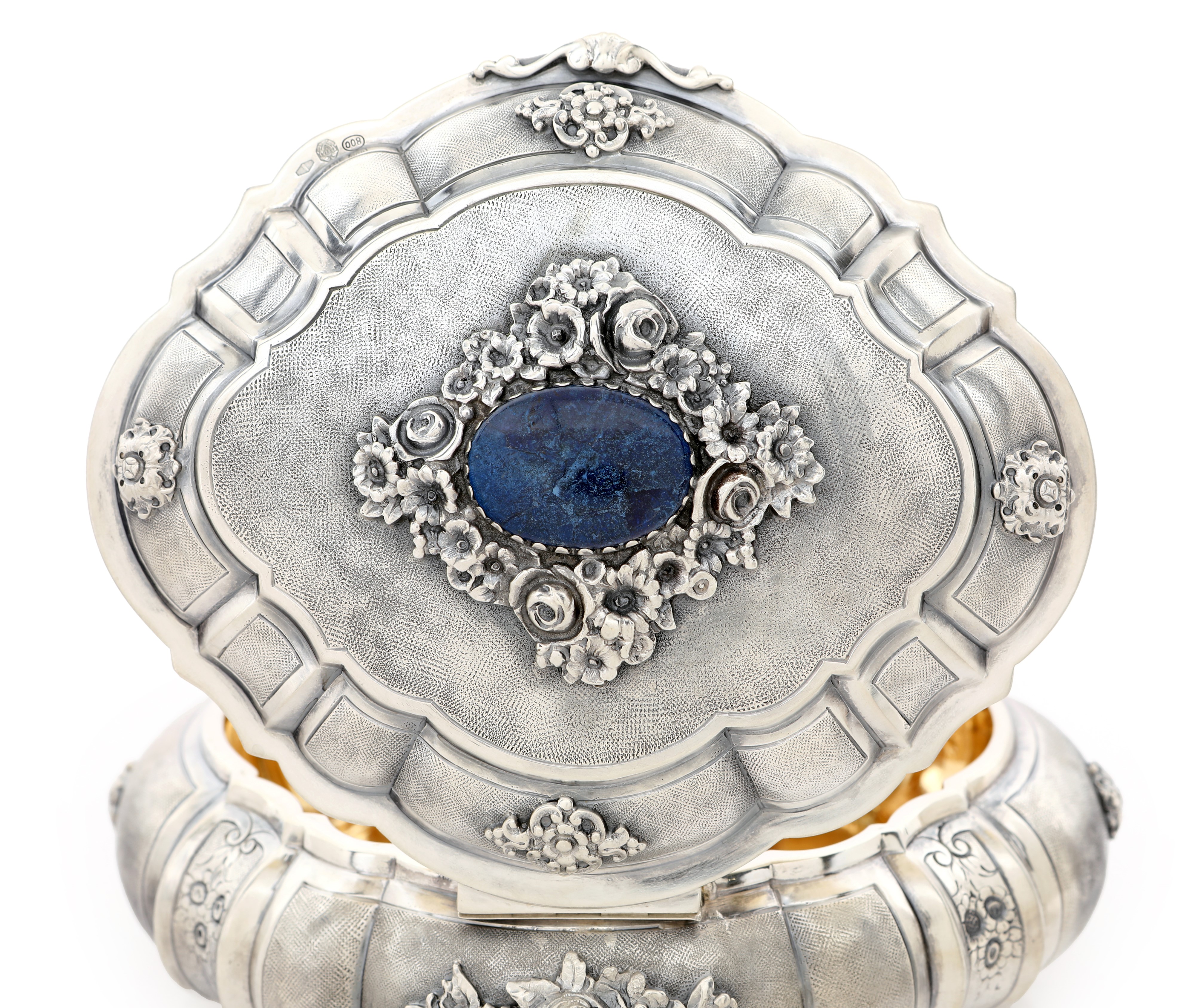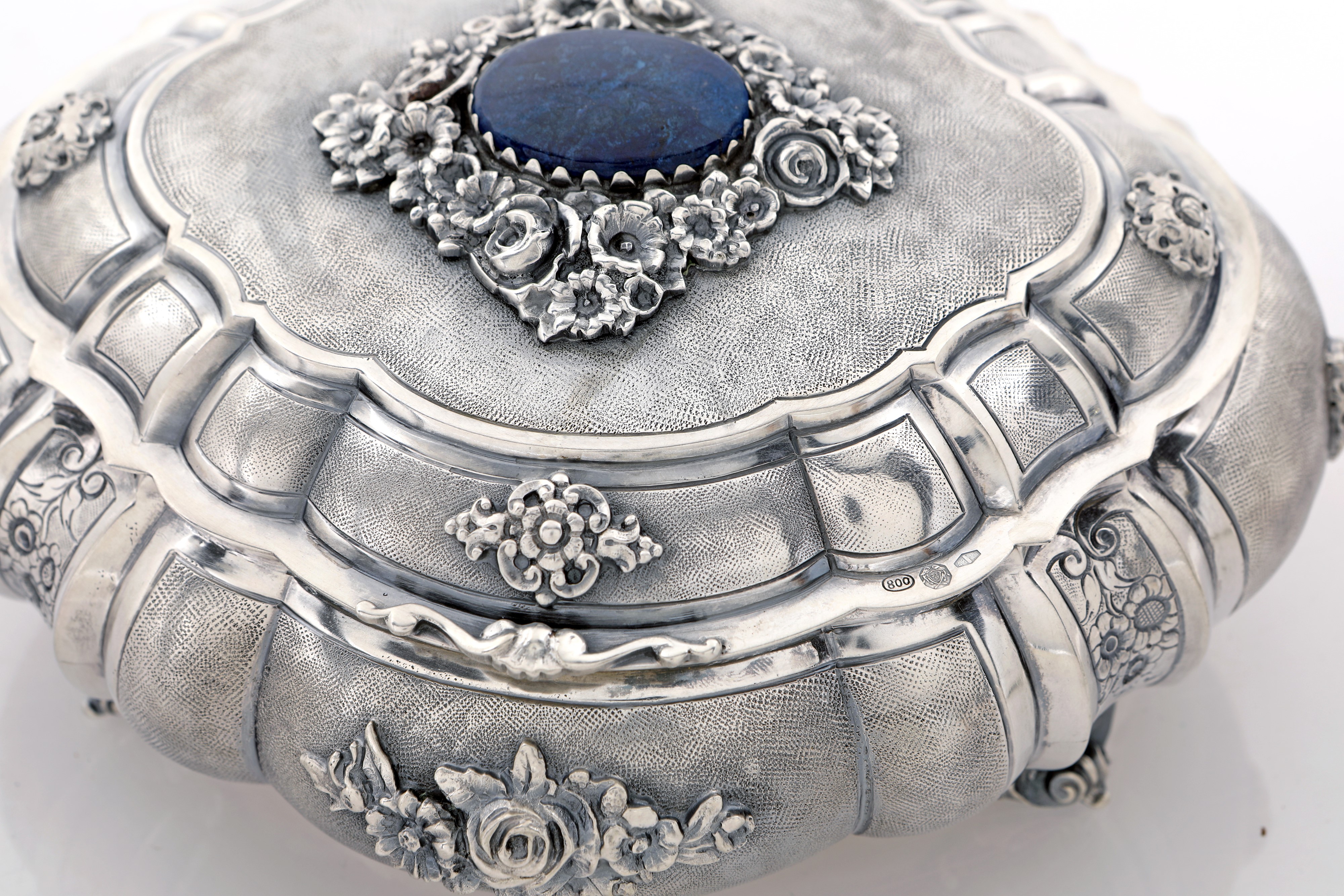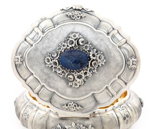 Cofanetto portagioie con gemma cabochon in sodalite e fiori applicati