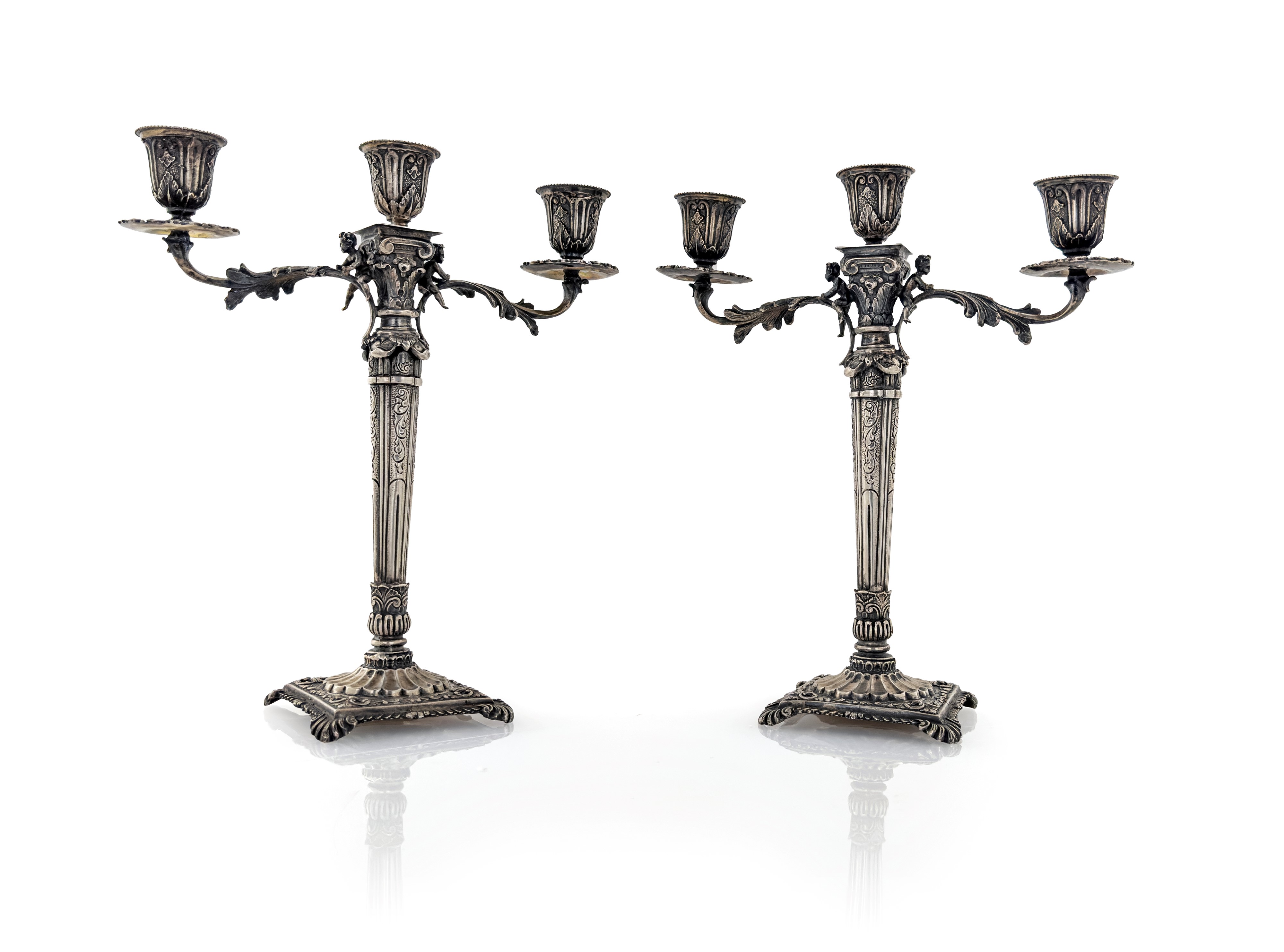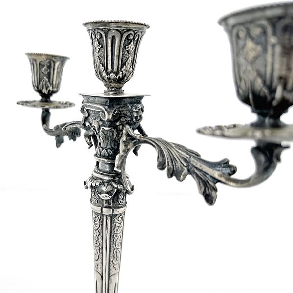 colonna rastremata con fusto percorso da fasce verticali con volute vegetali incise, la cui sommità è caratterizzata da un capitello sormontato da reggicandela a forma di vaso; ai lati si diramano due lunghe foglie frastagliate cavalcate all'attaccatura da piccole figure scultoree di amorino; base quadrangolare cesellata in rilievo