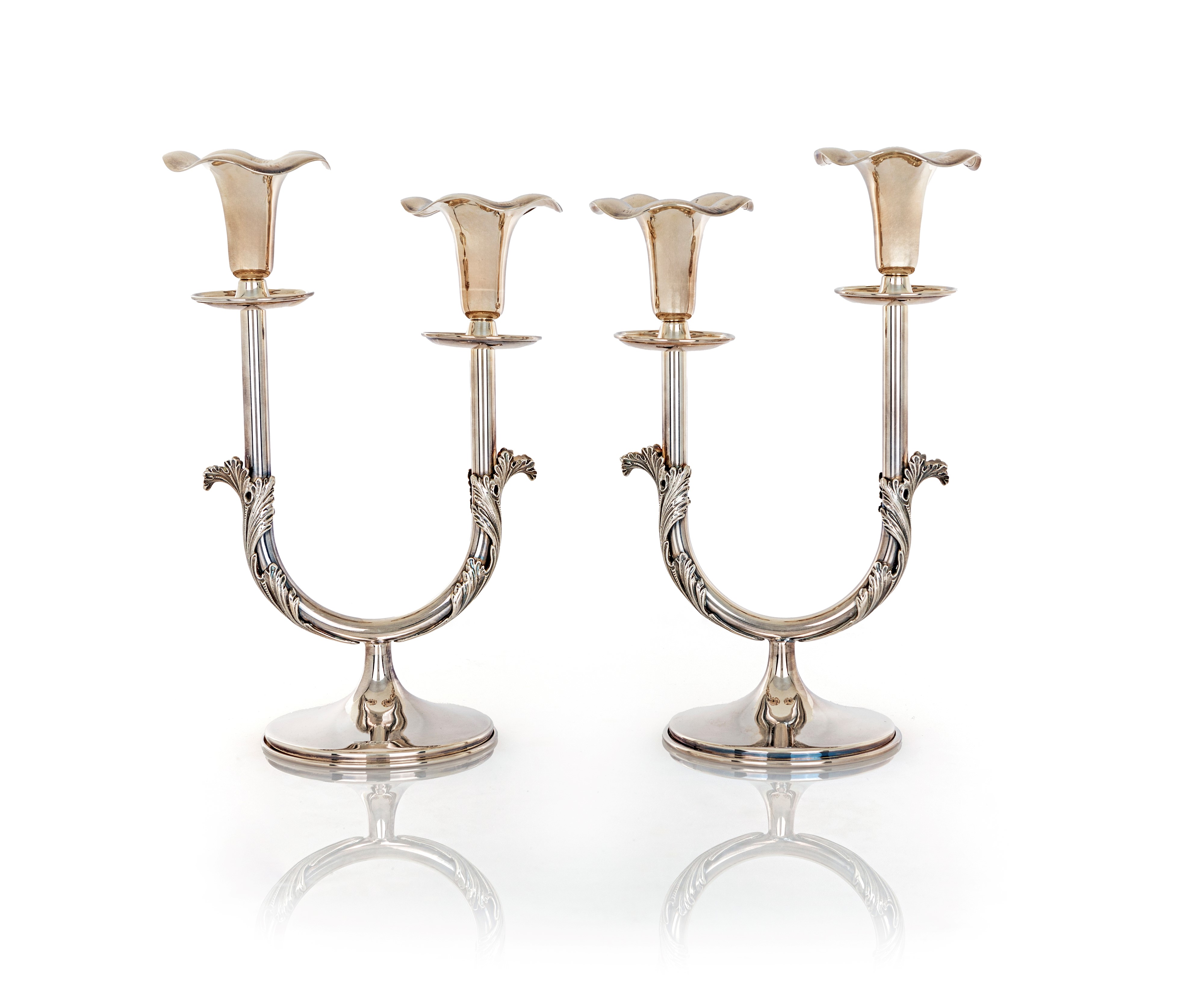 bracci arcuati paralleli ad altezza asimmetrica con portacandela a forma di campanula; piede circolare