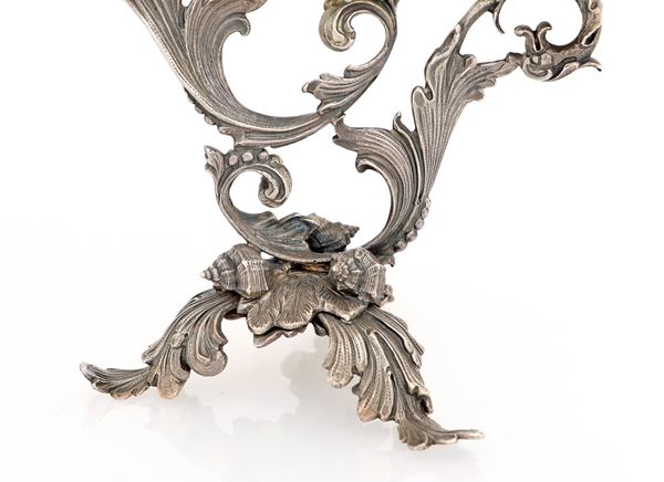 portacandele a vaso liscio su steli sinuosi costituiti da volute vegetali emergenti da base tripode