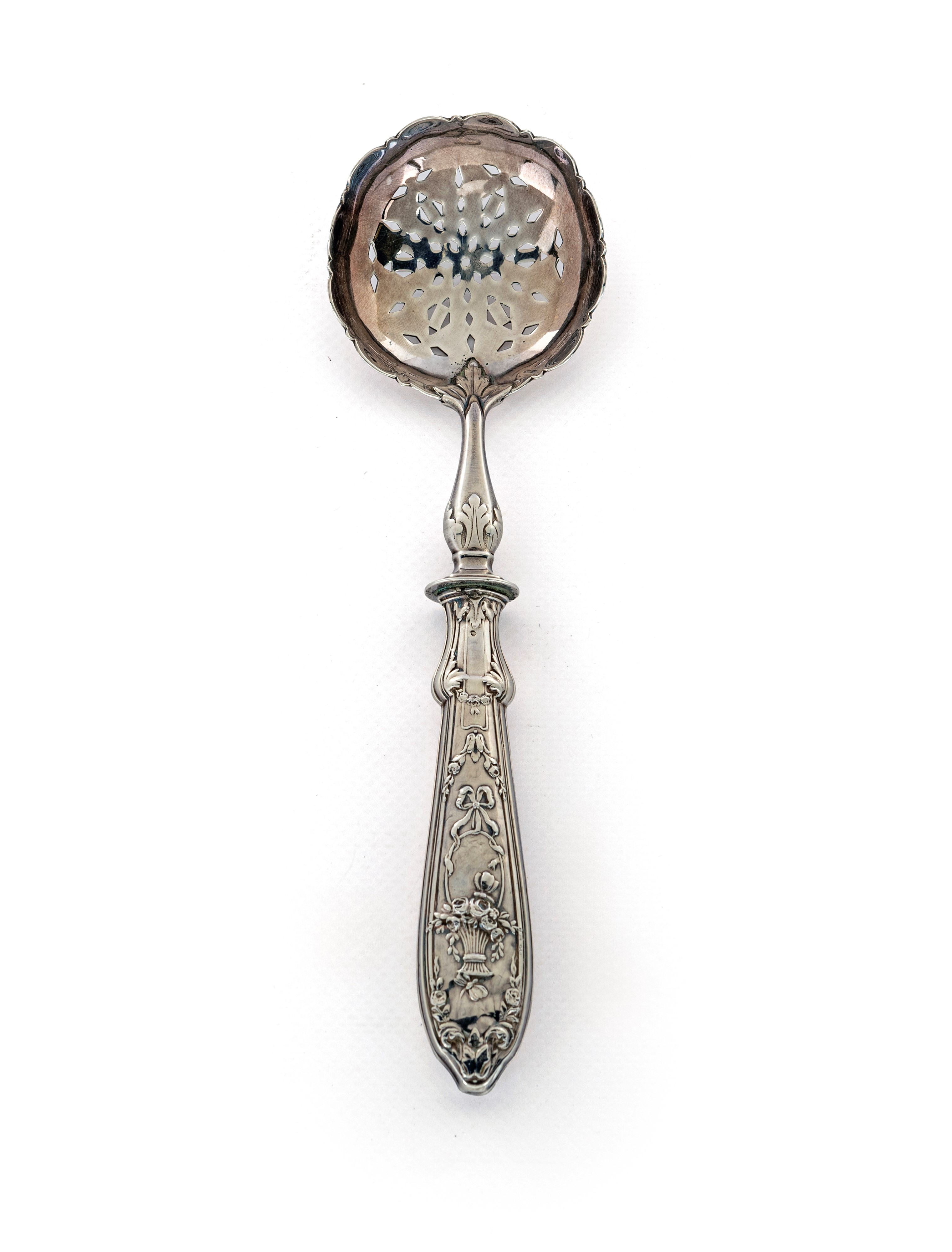 paletta circolare traforata a motivi geometrici e manico in lamina sbalzata