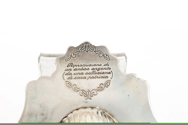 la conchiglia poggia su tre valve e reca iscrizione sotto l'impugnatura "riproduzione di un antico argento da una collezione di casa patrizia"; il sottobicchiere è cinturato da una ringhierina traforata
