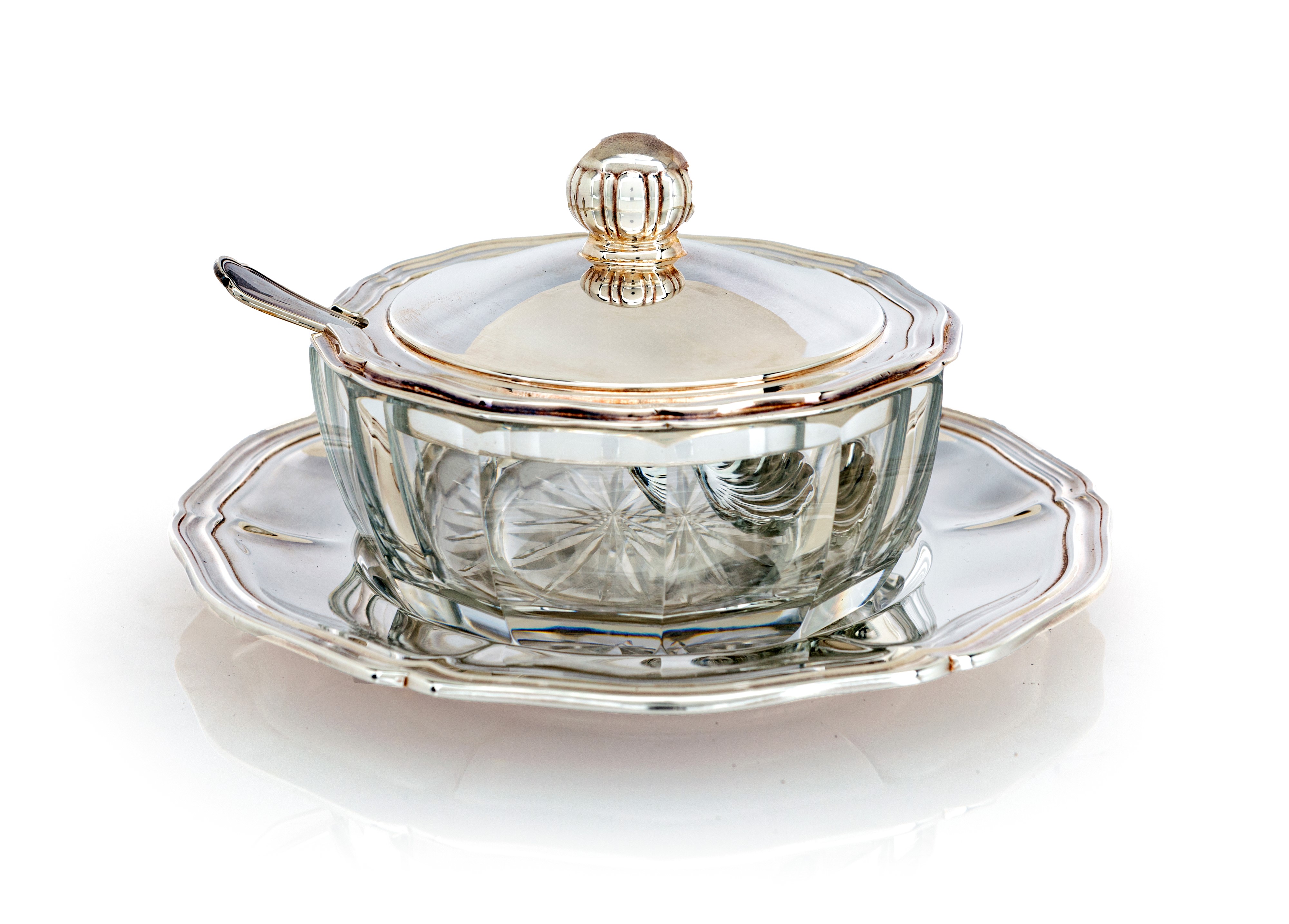 Formaggera tonda in cristallo con coperchio, piatto e cucchiaio in argento 800/000