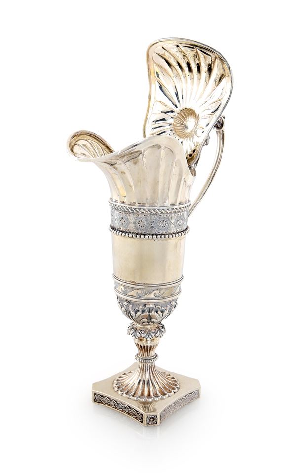 corpo ad anfora con versatoio scanalato sottolineato da una fascia delimitata da un cordone e da perline, decorata da corolle alternate a tulipani contrapposti su fondo inciso; coperchio incernierato sormontato da pomolo simulante un ciuffo, manico sagomato, piede scanalato poggiante su base quadrangolare con fascia guillochées ed angoli tronchi decorati da corolla