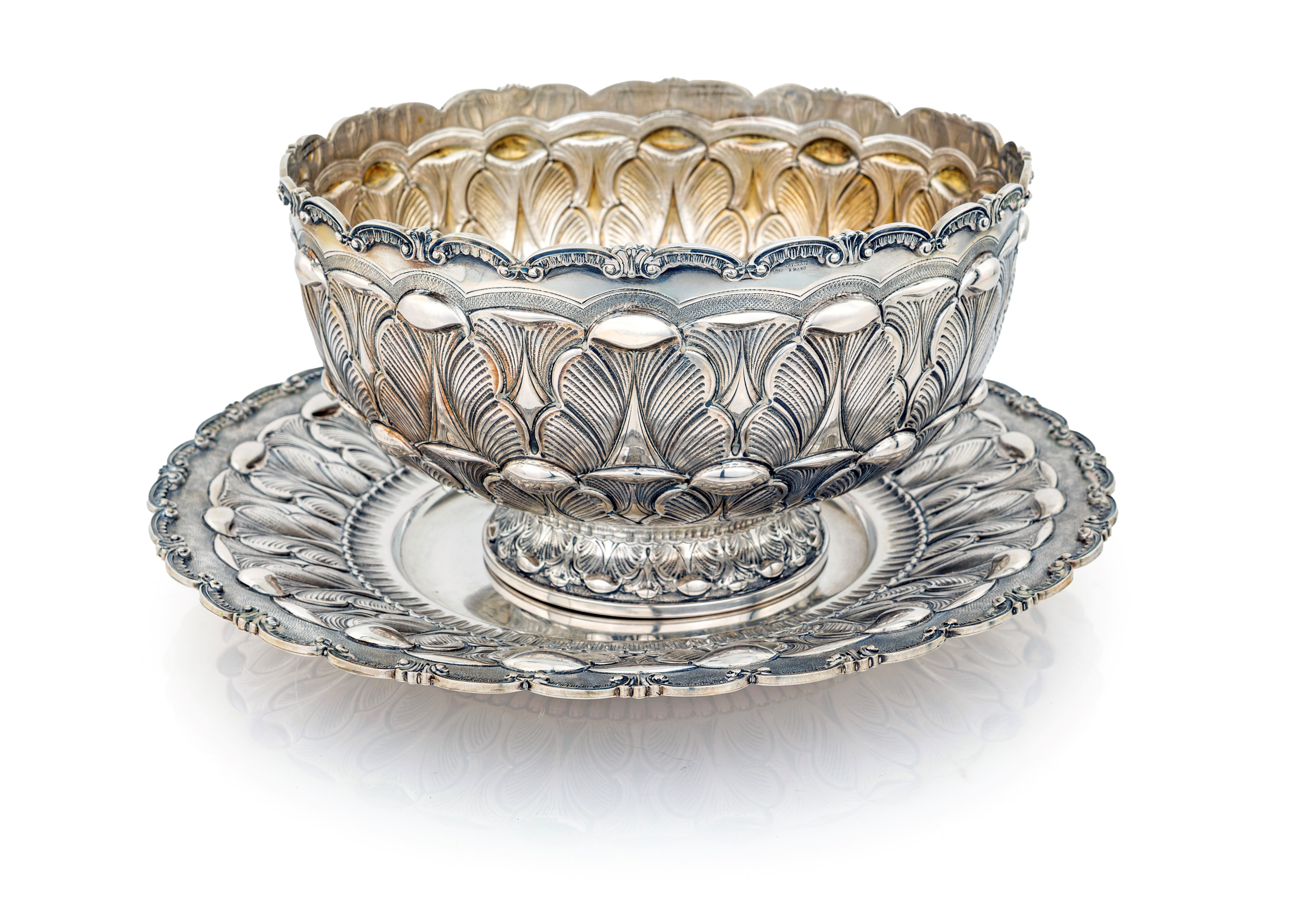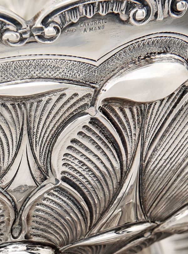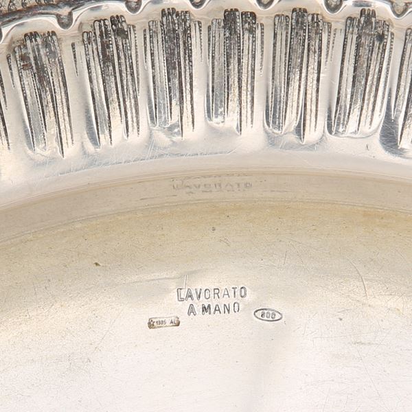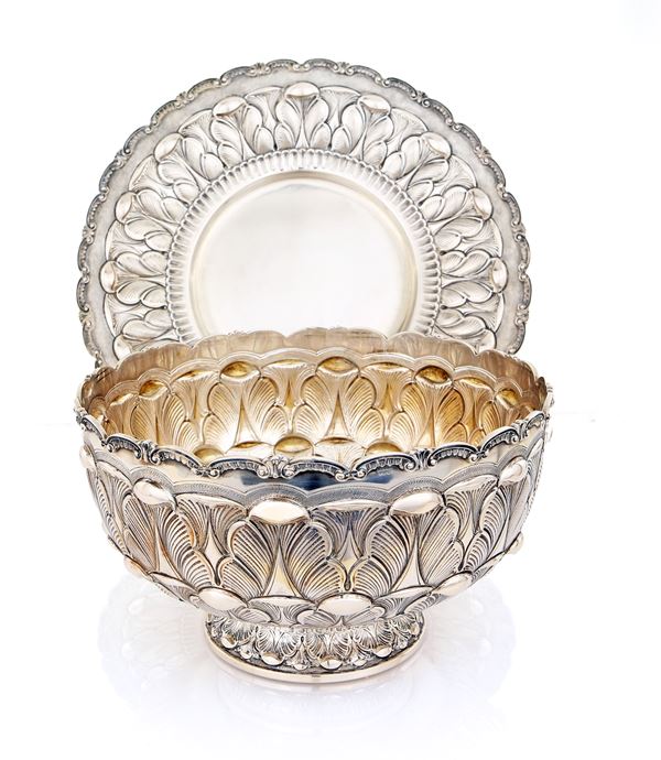 Grande coppa centrotavola con piatto, argento 800/000 lavorato a mano