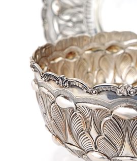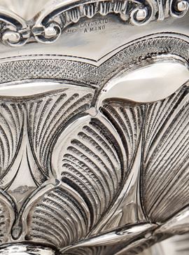 decorati da grandi palmette sbalzate ed incise; orli centinati definiti da volute terminanti a ricciolo sottolineate da lambrecchini cesellati