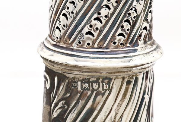 corpo a balaustro decorato da nervature diagonali alternate a scanalature; al centro cartigli per incisione. Coperchio sormontato da fiammella