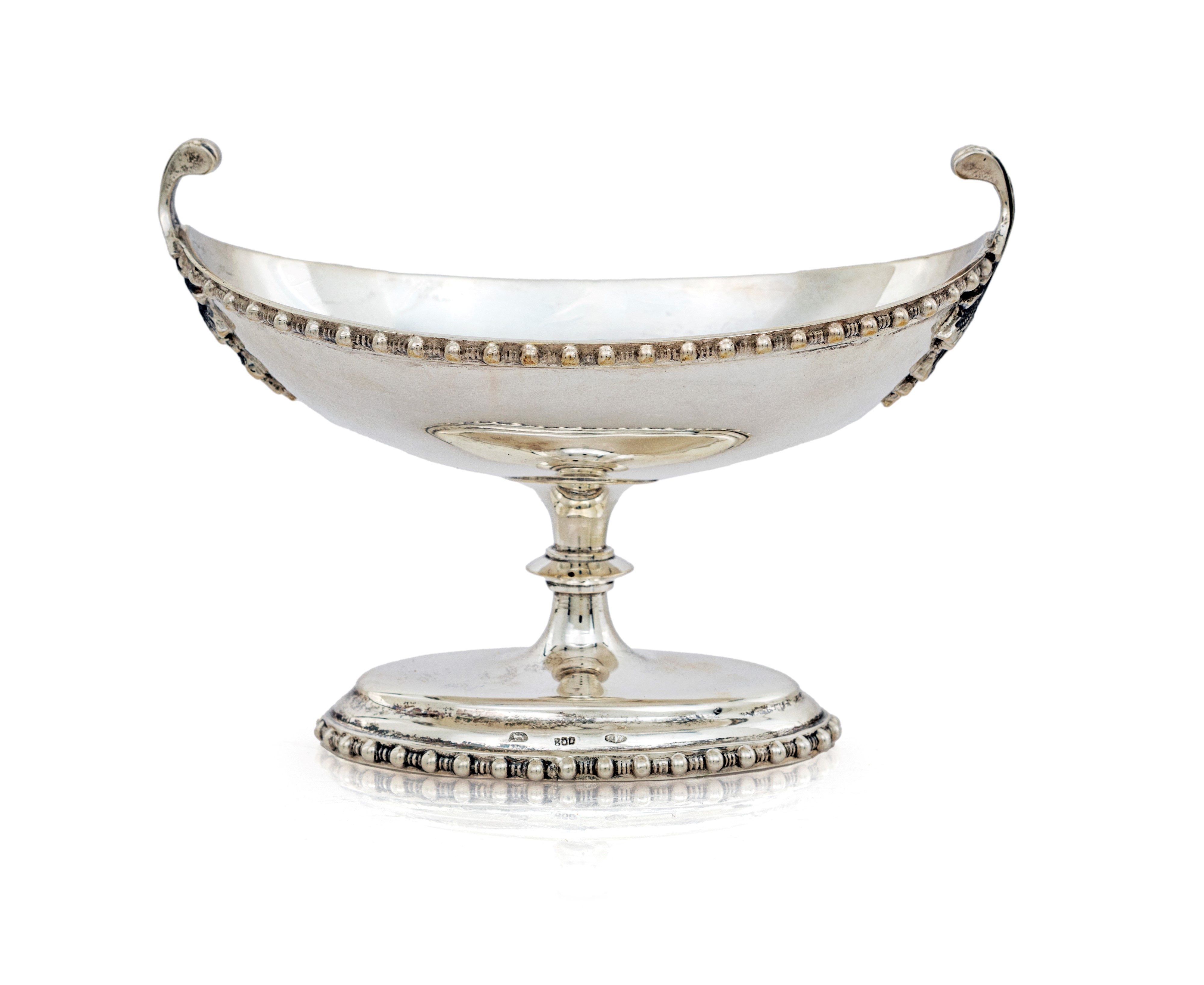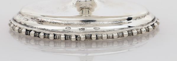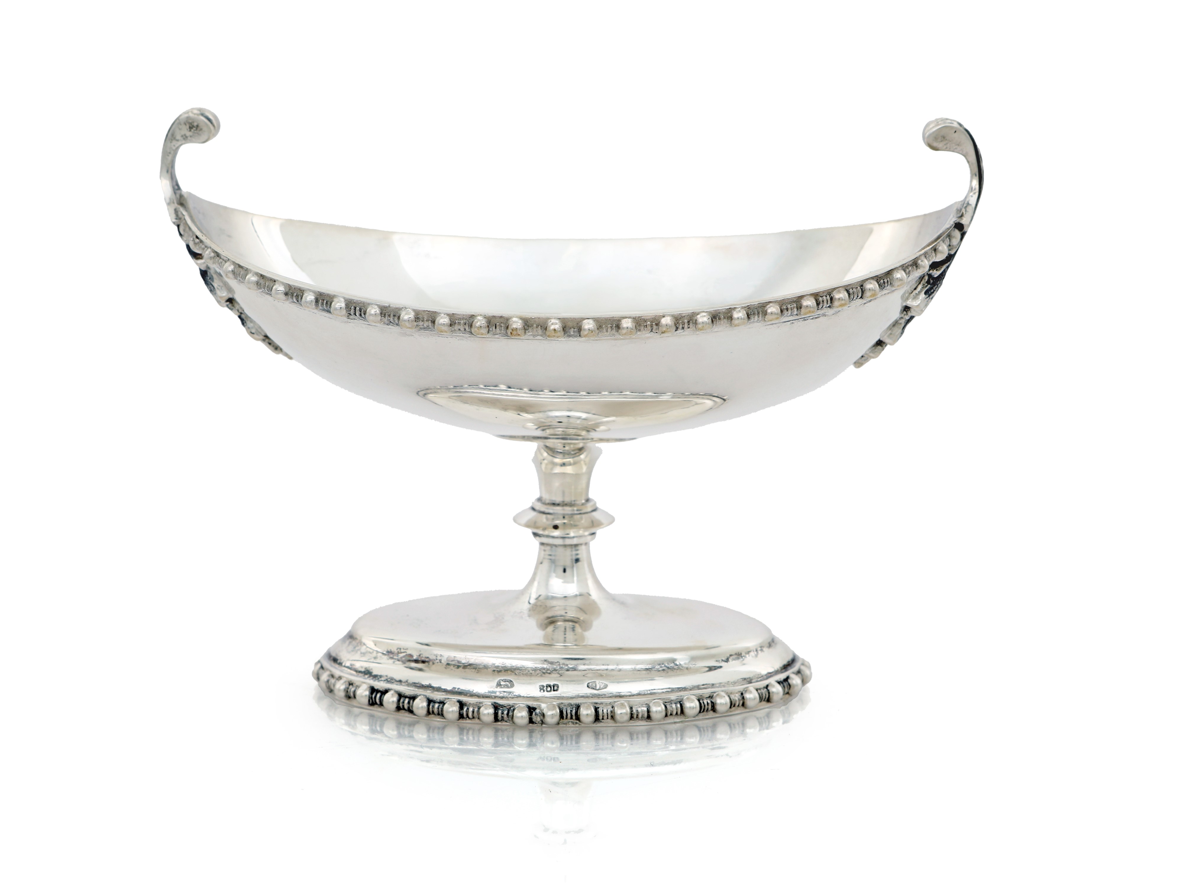 Navicella con profilo perlinato ed anse incurvate emergenti da palmette