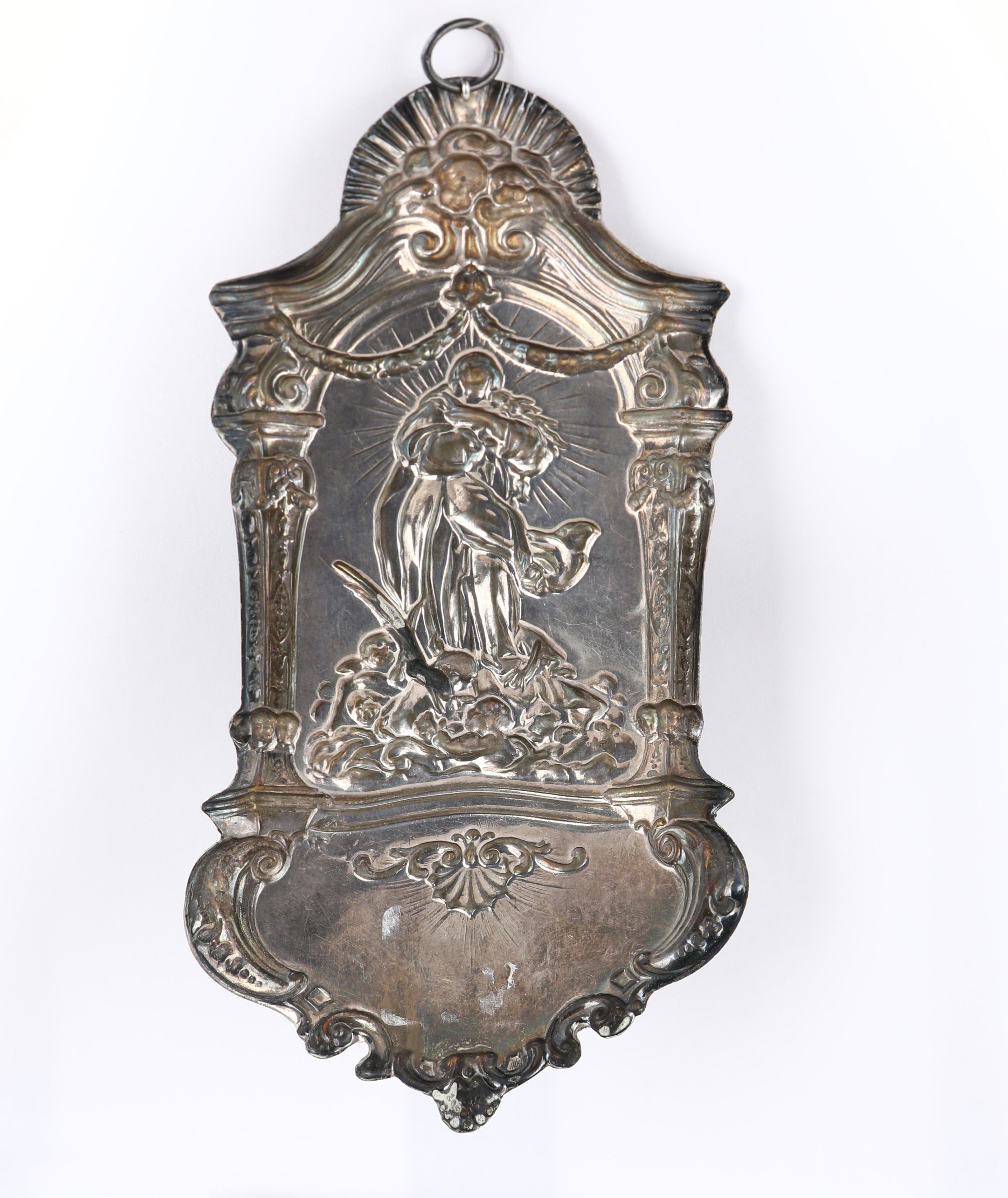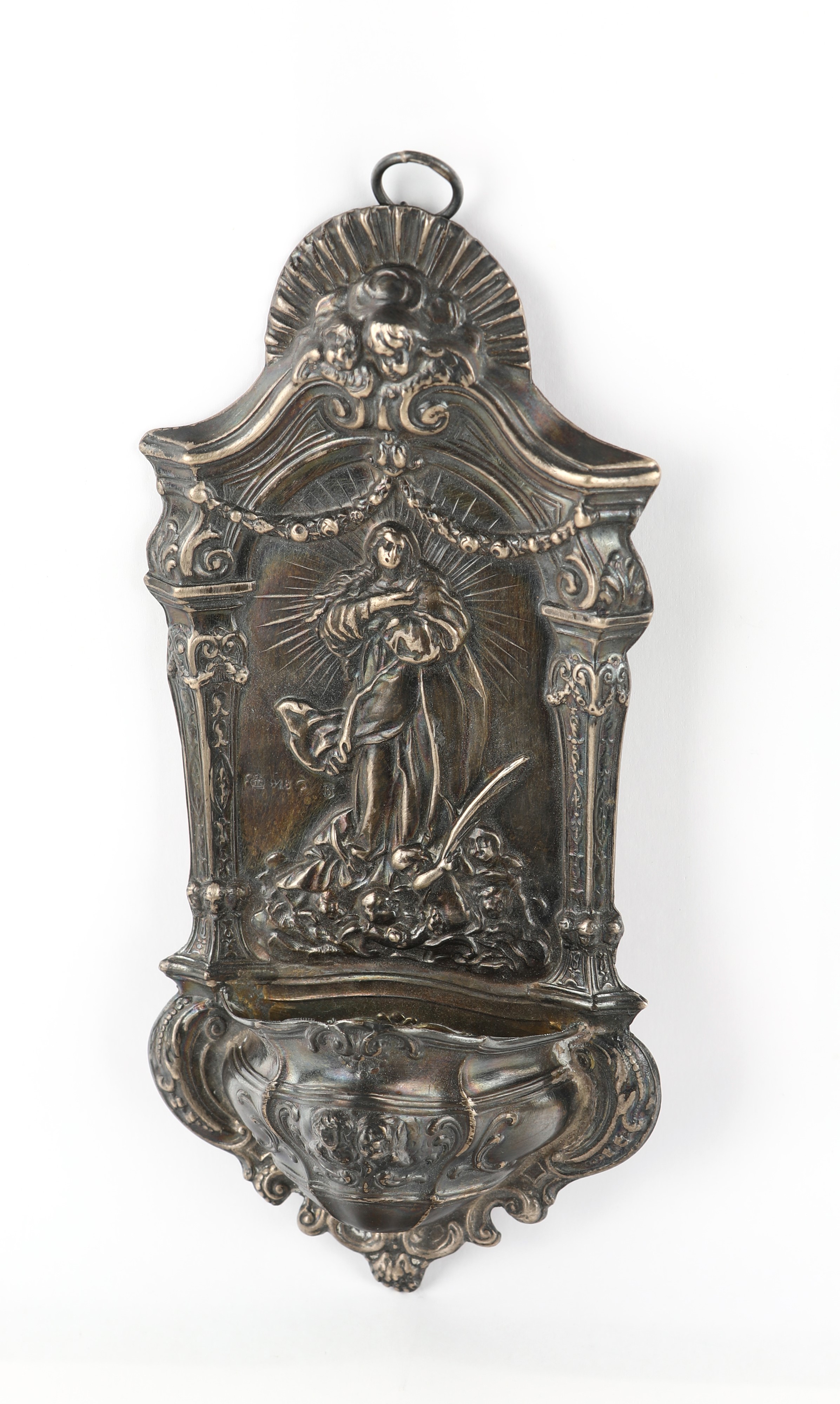 al centro figura dell'Immacolata entro edicola architettonica con vaschetta sagomata