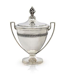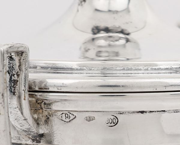 a forma di coppa su piede circolare, ornata da una piccola cornice cesellata a palmette; coperchio sormontato da un trionfo stilizzato