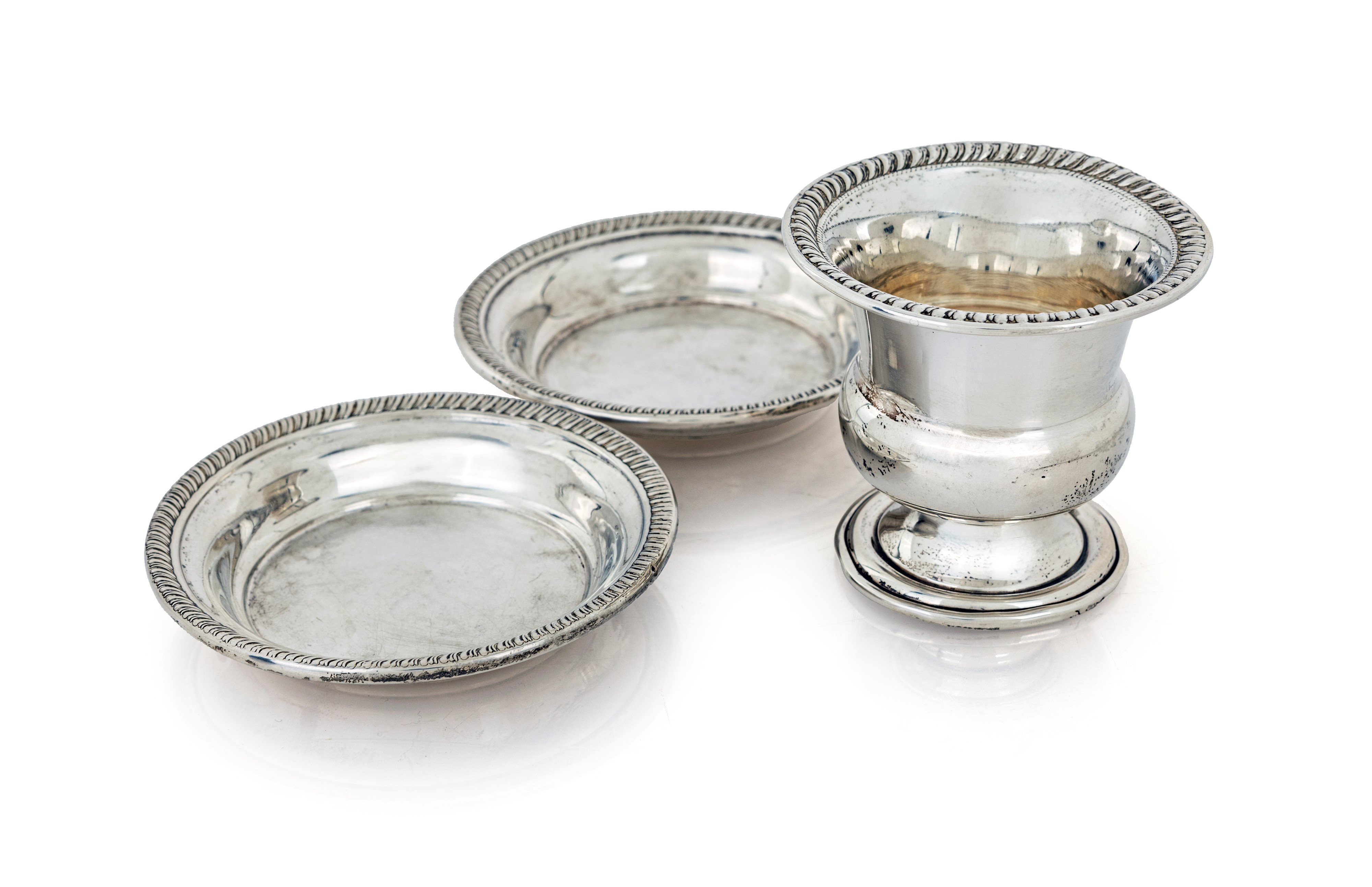 Piccolo vaso a cratere e coppia di piattini in argento