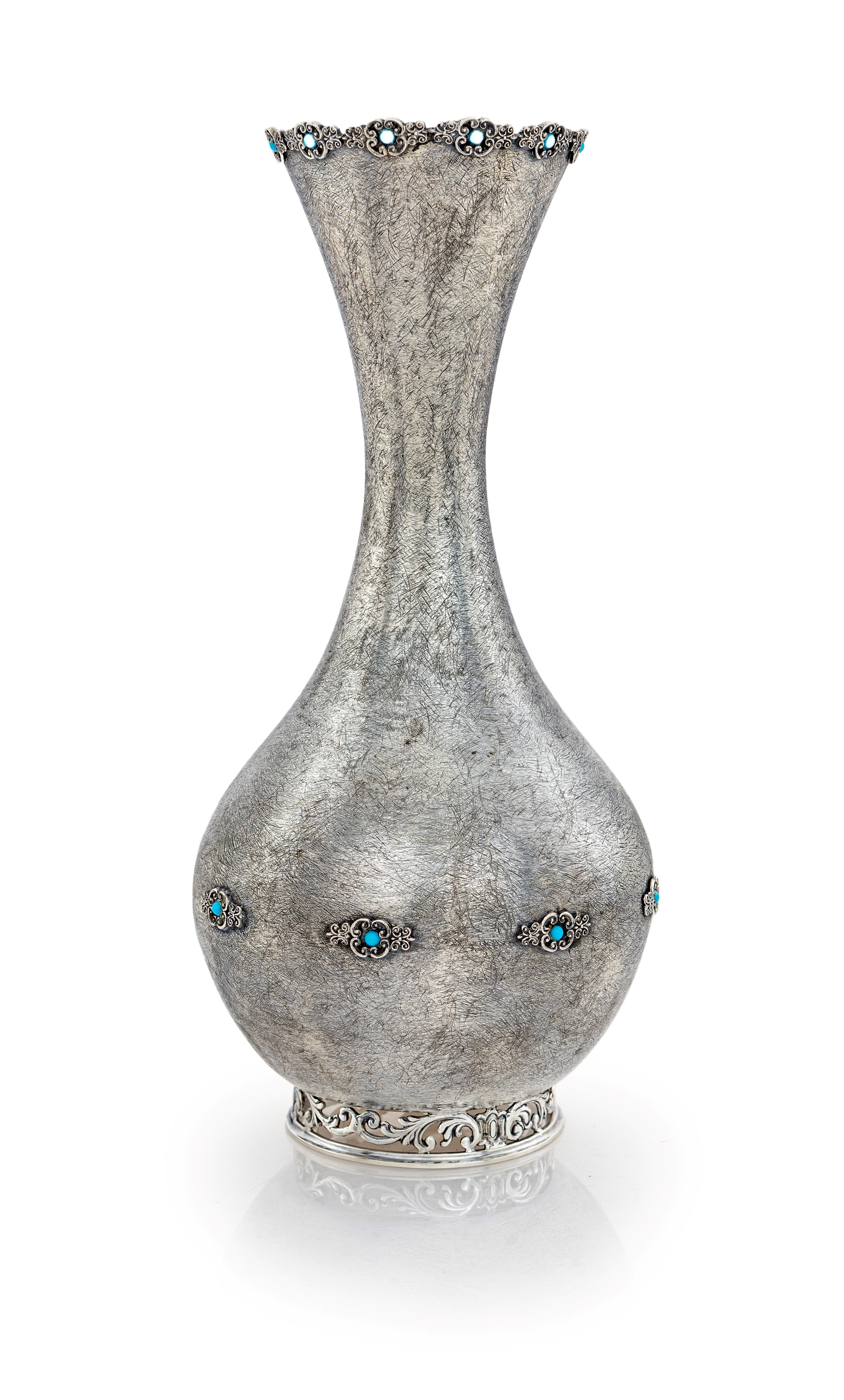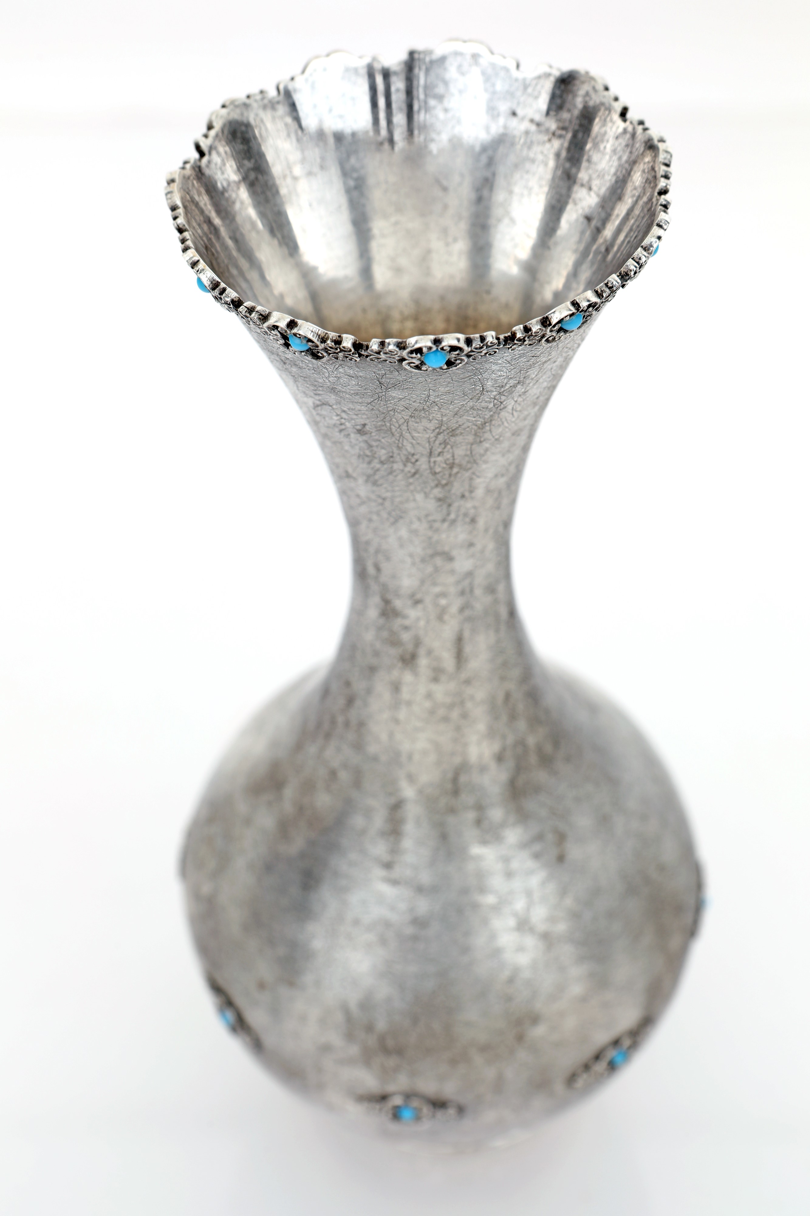 Piccolo vaso in argento a superficie satinata con piccoli turchesi