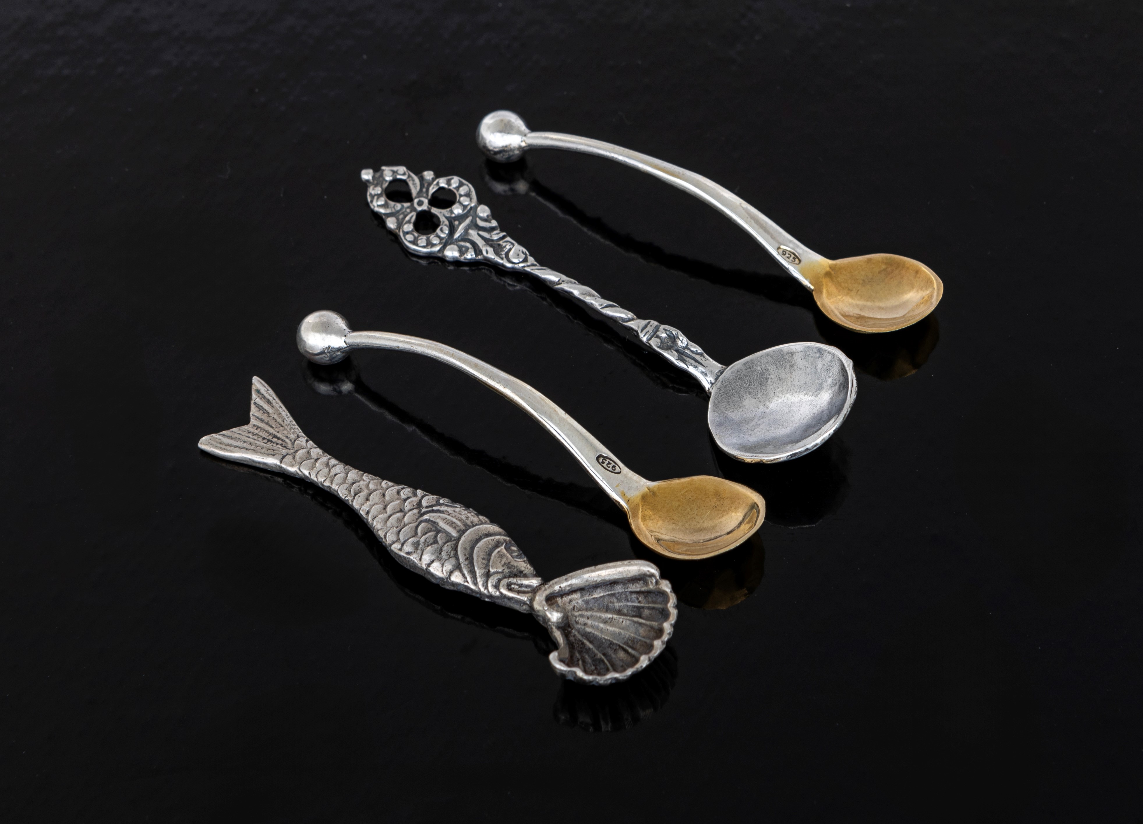 uno con paletta a forma di conchiglia ed impugnatura a pesce; uno con impugnatura cesellata ed una coppia con esile impugnatura sormontata da una piccola sfera