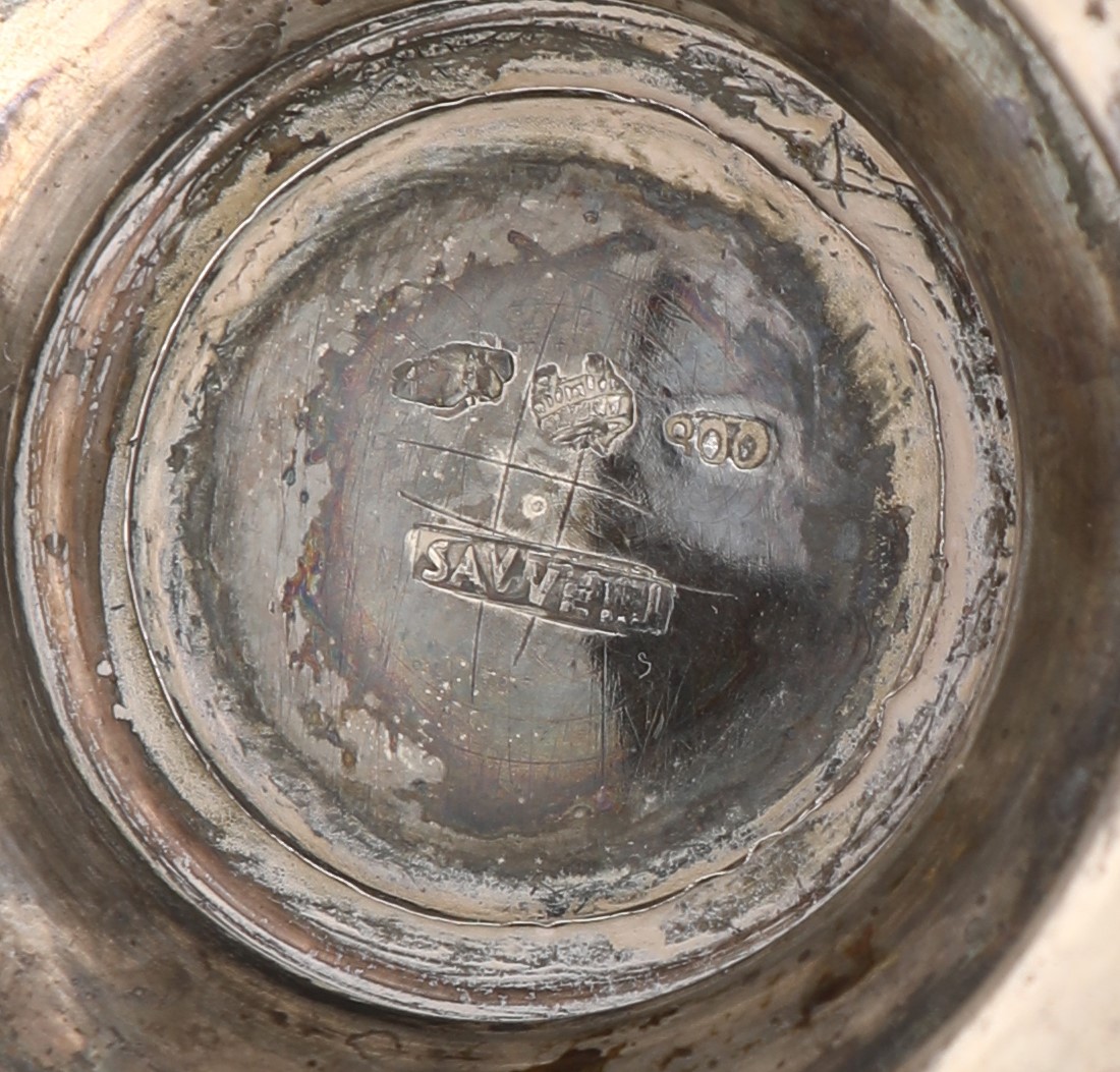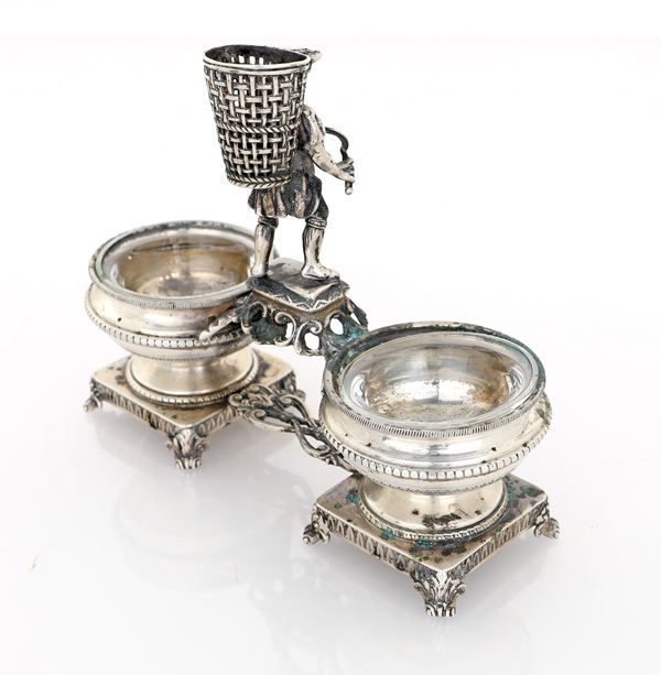 a due vaschette a forma di coppa con contenitore interno in vetro, riunite da traversa sormontata da figura in abiti rinascimentali con falcetto e gerla sulle spalle ad uso di contenitore per stuzzicadenti