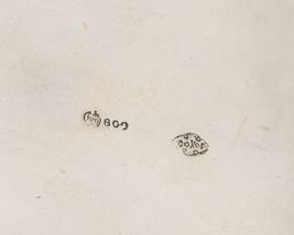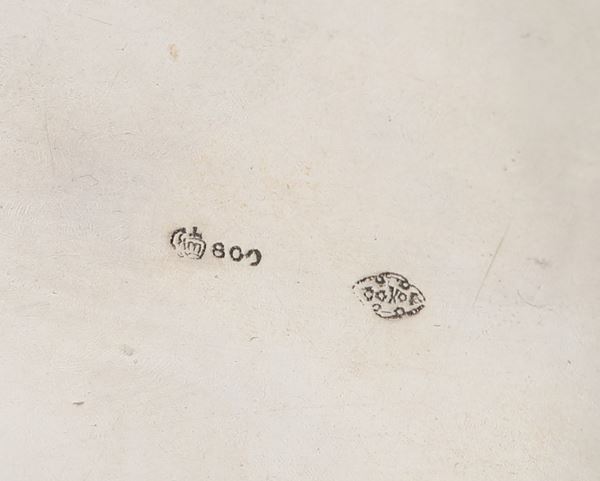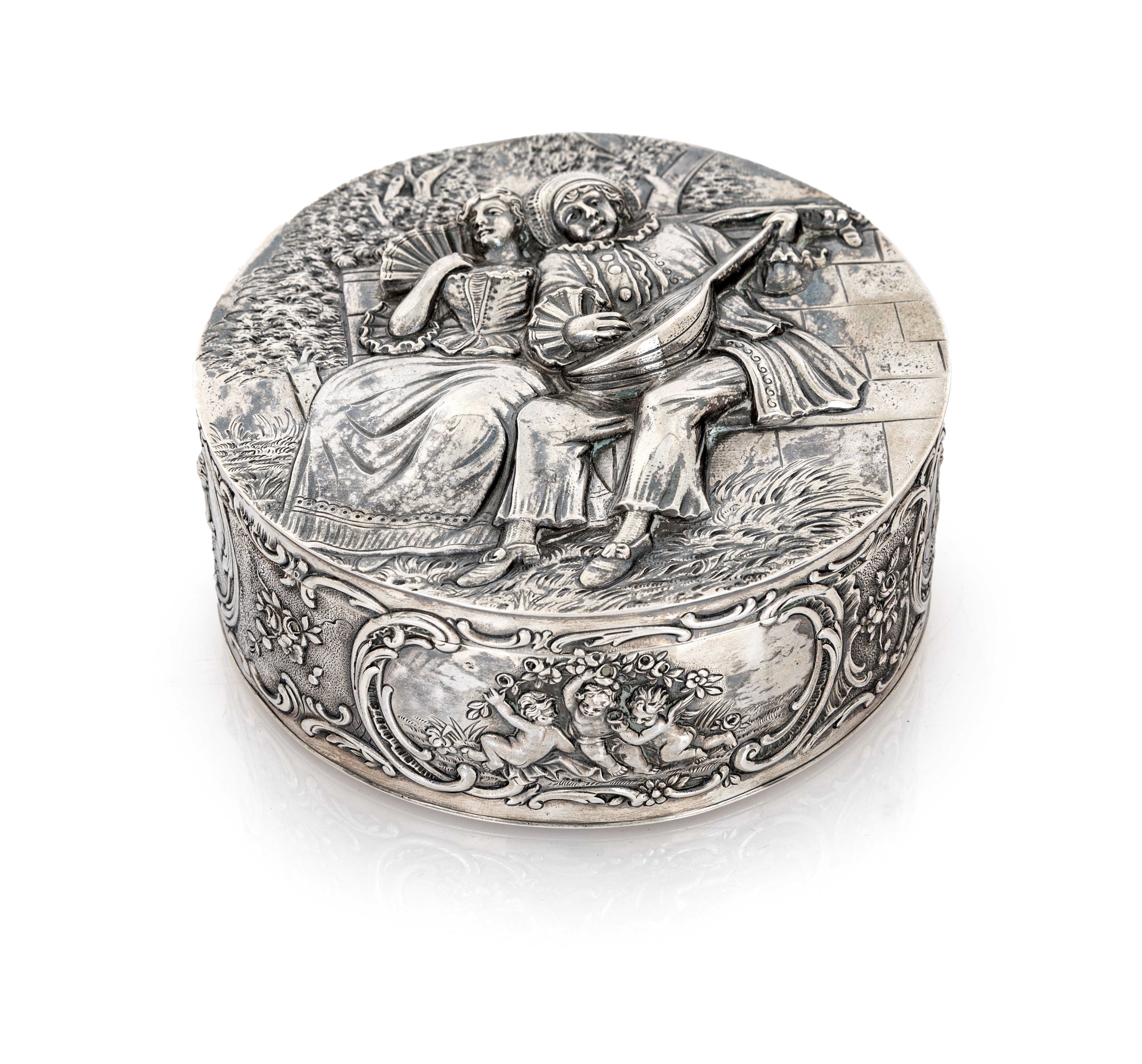 sul coperchio scena galante con dama e suonatore di liuto; lungo la fascia cartigli con amorini alternati a composizioni di fiori