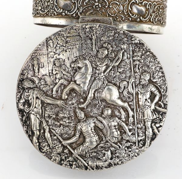 Scatola circolare in argento con scena di battaglia in bassorilievo