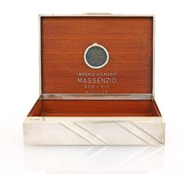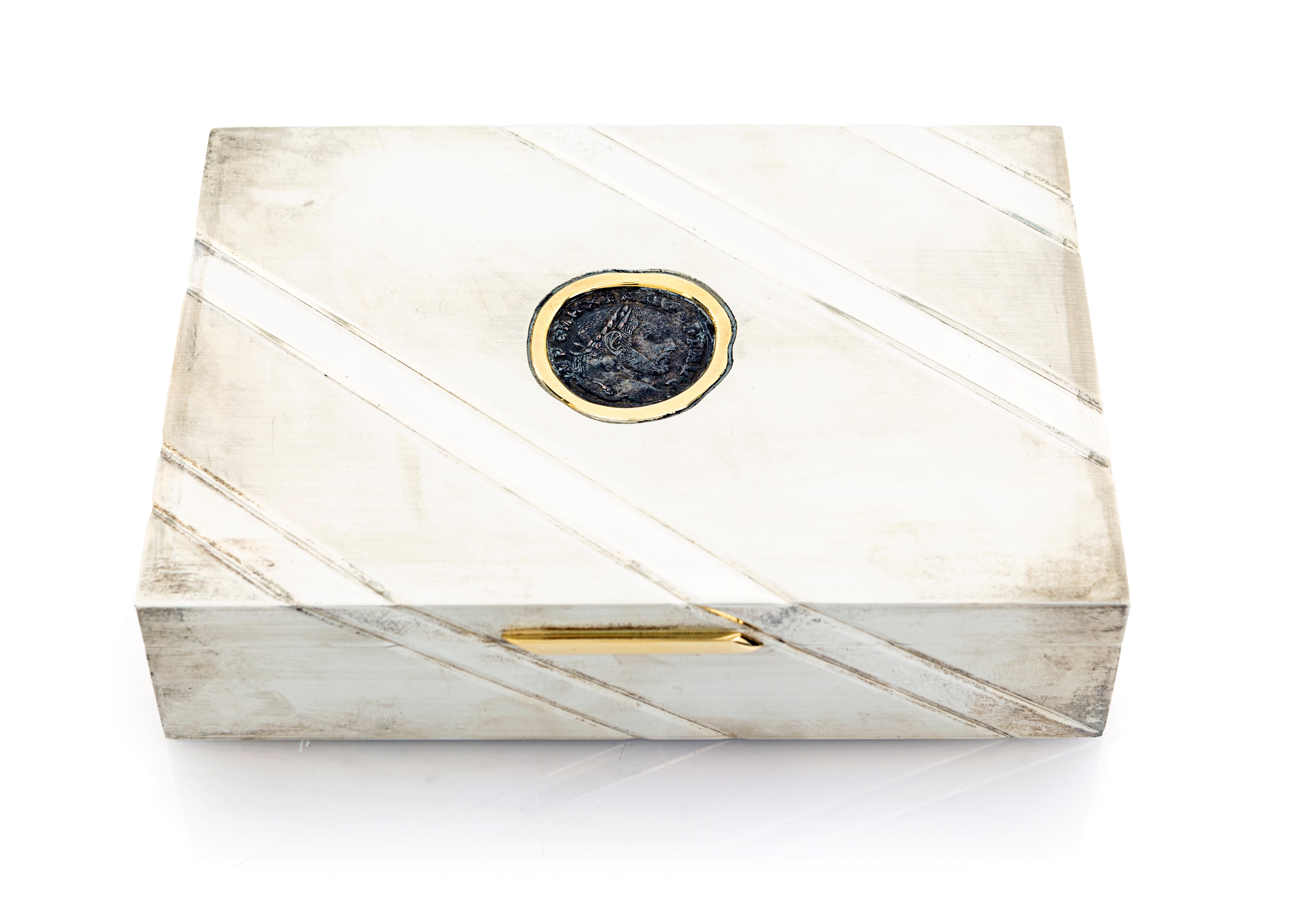 coperchio centrato da moneta romana con castone dorato e superficie caratterizzata da fasce diagonali; interno in legno. Difetti