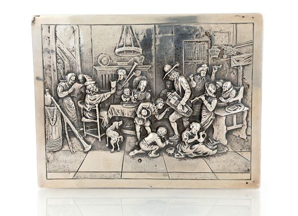 sul coperchio una scena d'interno animata da musici, donne e bambini che giocano; ogni lato è decorato da diverse scene di genere di gusto fiammingo