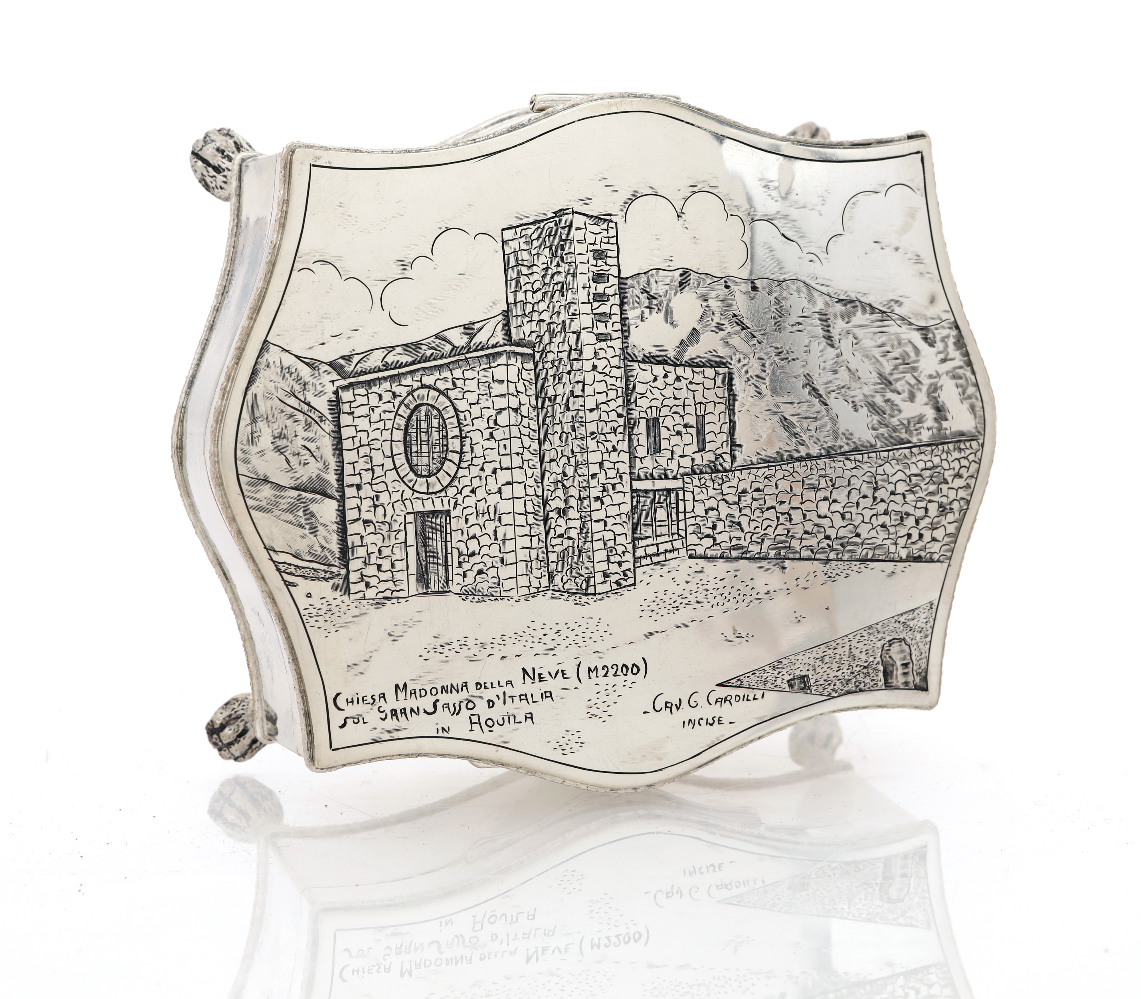Scatola sagomata con decorazione incisa a raffigurare la facciata della Madonna della Neve sul Gran Sasso d'Italia in Aquila