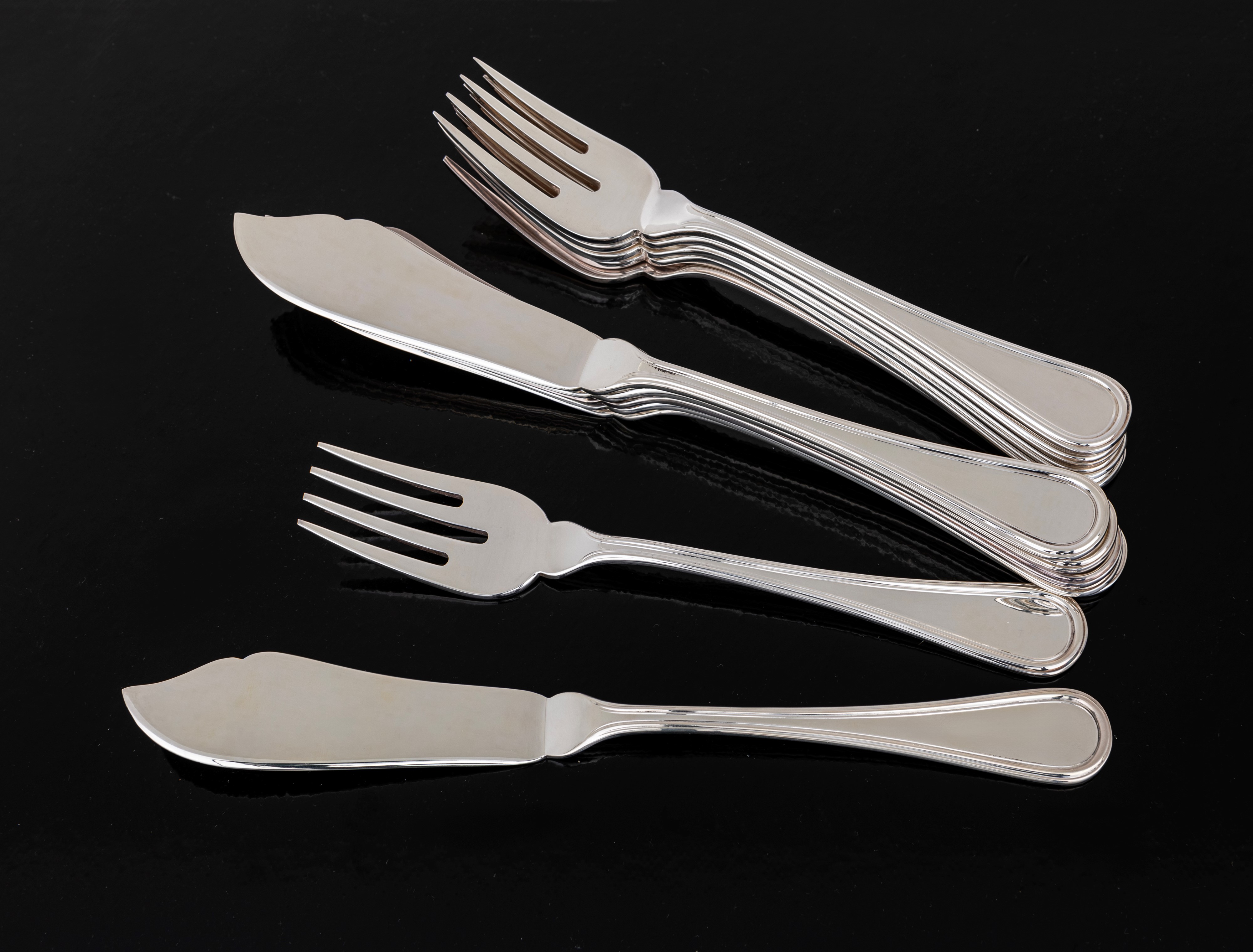 composto da sei forchette ed altrettanti coltelli con lama a sciabola; impugnature stile inglese