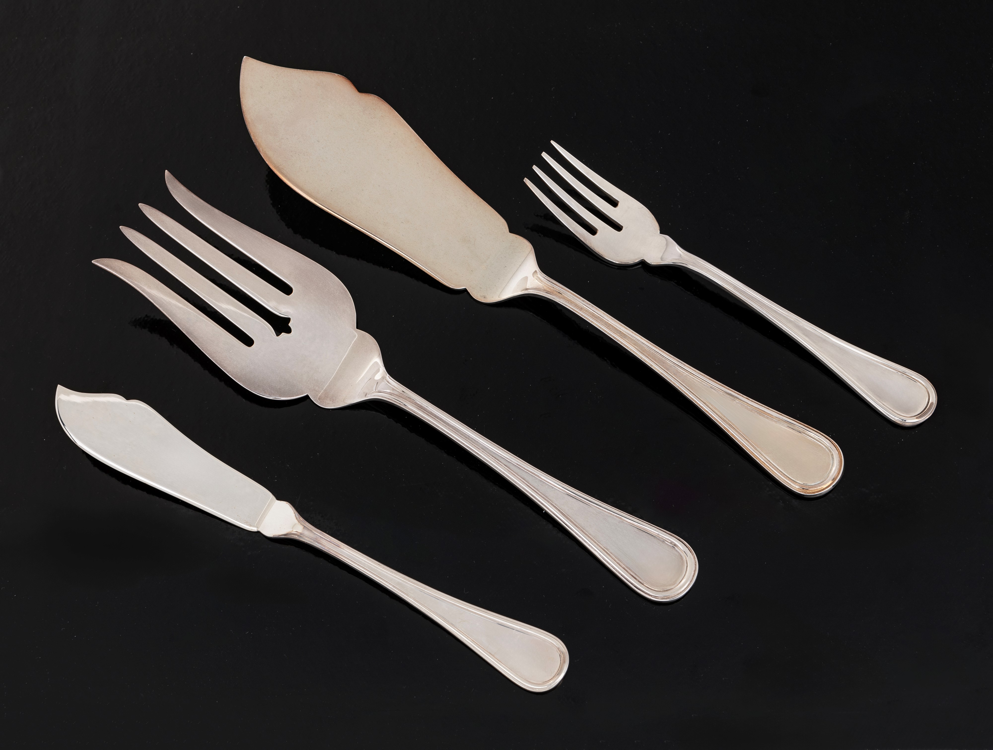 dodici forchette (cm 17,3 - gr. 704); dodici coltelli con lama a sciabola (cm 20,7 - gr. 730) e due posate per servire (cm 24 e cm 27 - gr. 220)
