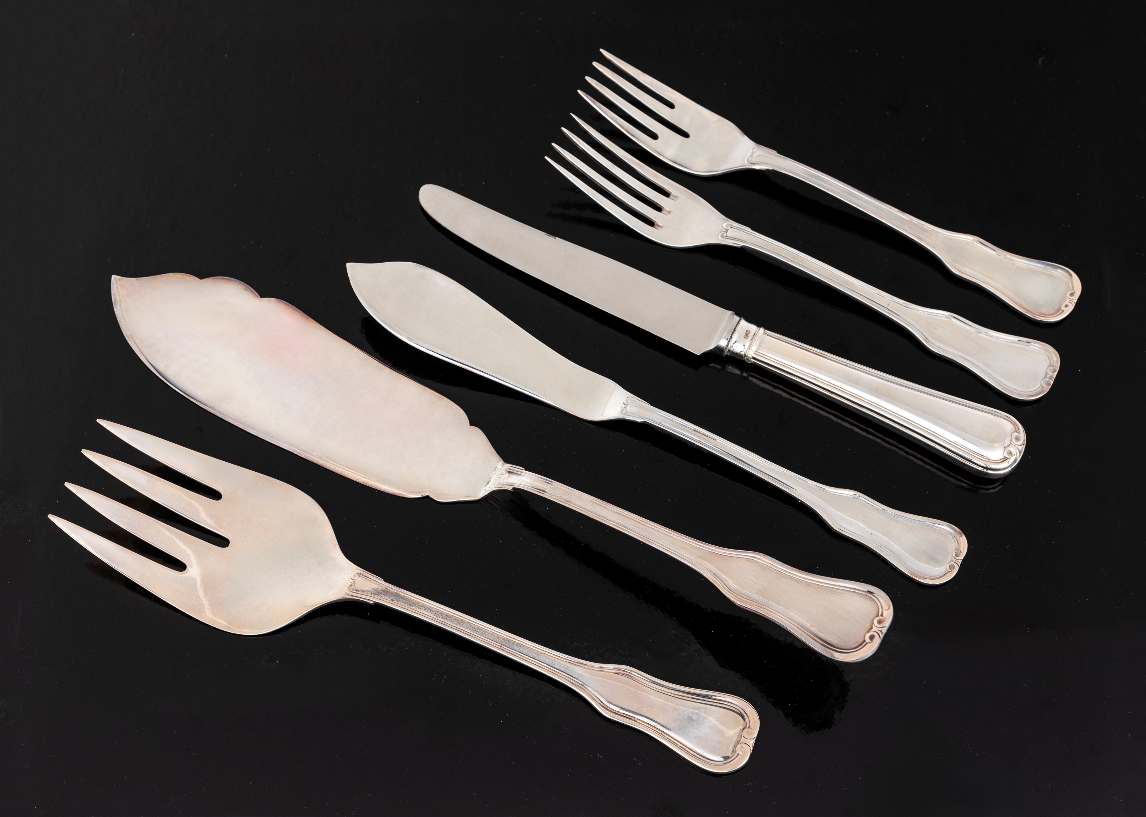 dodici forchette (cm 17,3 - gr. 520) ed altrettanti coltelli da pesce (cm 21,3 - gr. 636); paletta e forchetta per servire (cm 27,5 e cm 22 - gr. 198); dodici forchette da frutta (cm 17,5 - gr. 480) e dodici coltelli (cm 21,2)
