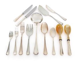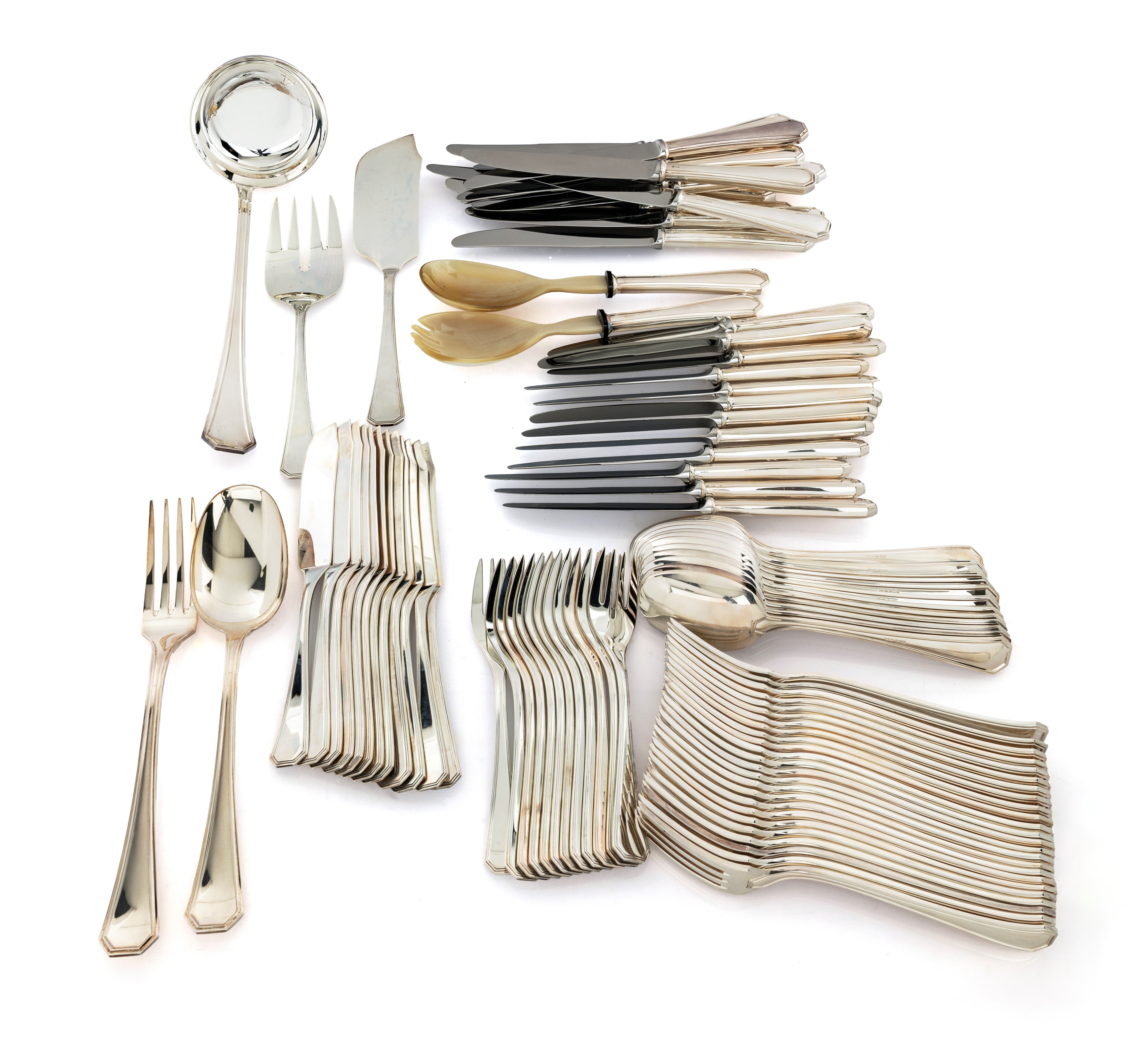 dodici cucchiai da minestra (cm 20 - gr. 970); ventiquattro forchette (cm 20 - gr. 1998) e dodici coltelli da pasto (cm 24,5); dodici coltelli da frutta (cm 21,5); dodici forchette da pesce (cm 17 - gr. 596) ed altrettanti coltelli (cm 21 - gr. 698); due posate per servire (cm 23 e cm 25 - gr. 224); due posate da insalata in argento e corno (cm 23); cucchiaio e forchetta da portata (cm 24 - gr. 224); un mestolo (cm 30 - gr. 264). Mancanti le forchette da frutta