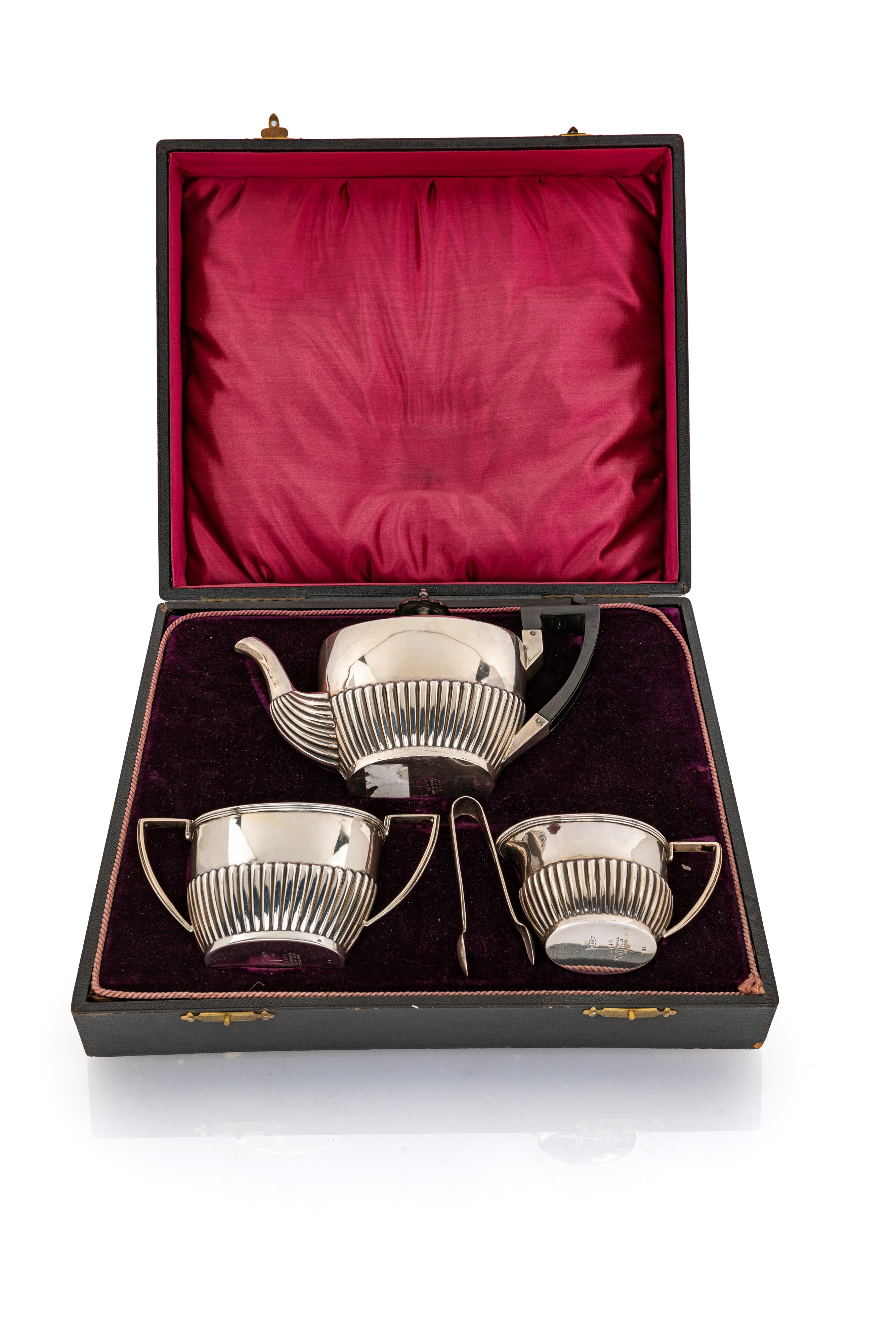 composto da teiera, lattiera, zuccheriera e pinze entro astuccio