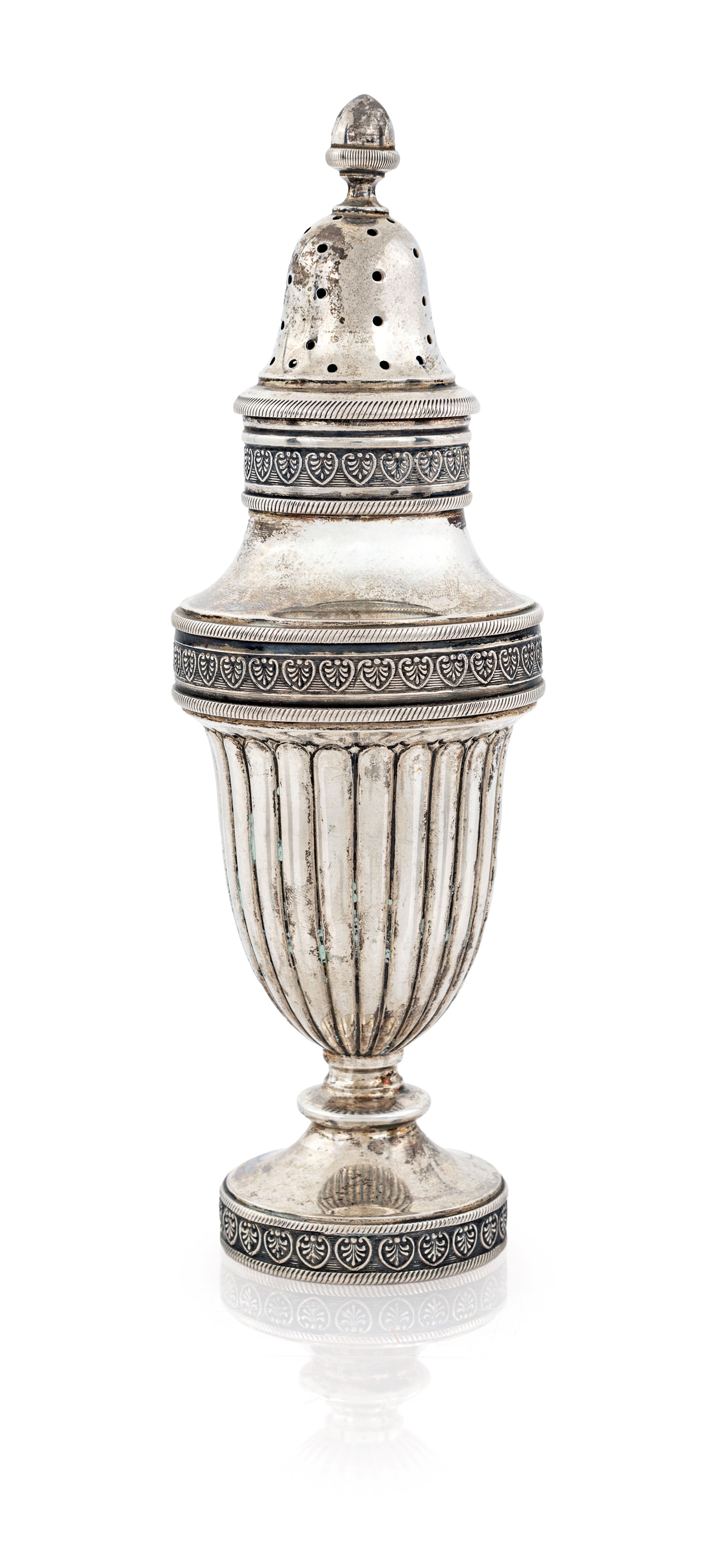 corpo a baso baccellato su piede circolare con profilo a palmette, elemento decorativo ripreso alla base del collo e sull'orlo superiore; coperchio a cupolino sormontato da una ghianda