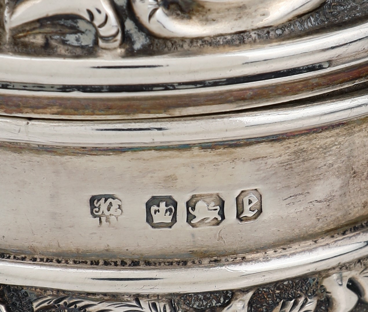 corpo cilindrico con fitta decorazione sbalzata a fiori e motivi vegetali; coperchio con chiusura a ...