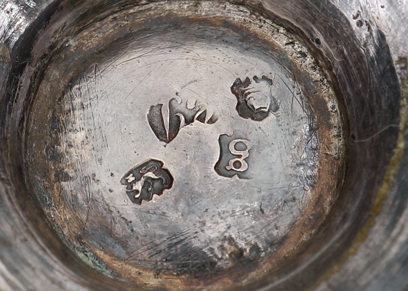 caratteristica forma a vaso su piede circolare, con superficie centrata da cartiglio con incisione circondato da fiori sbalzati; coperchio a cupolino sormontato da una trottola