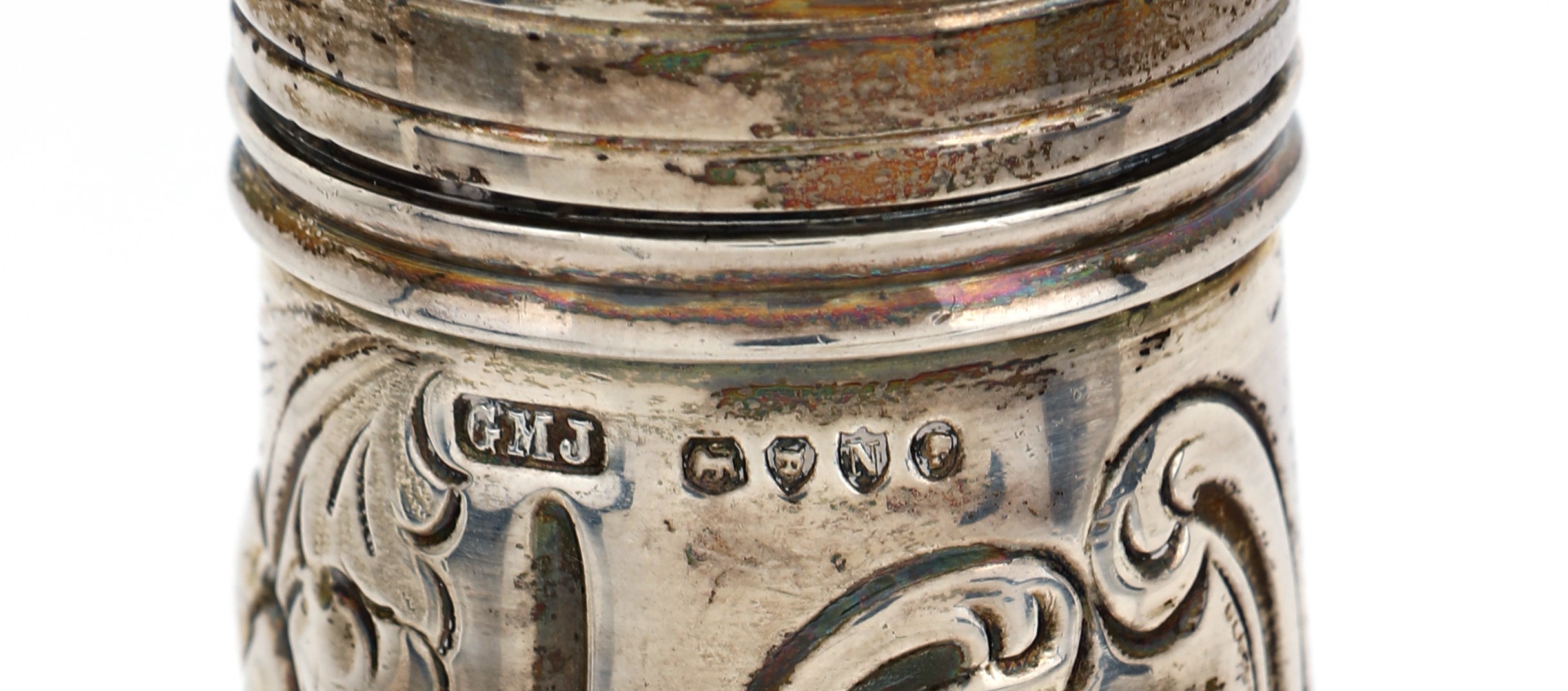 corpo a balaustro su basso piede circolare, decorato da composizioni di fiori sbalzati alternati a scanalature lievemente curve; coperchio a cupolino sormontato da pinnacolo con chiusura a vite