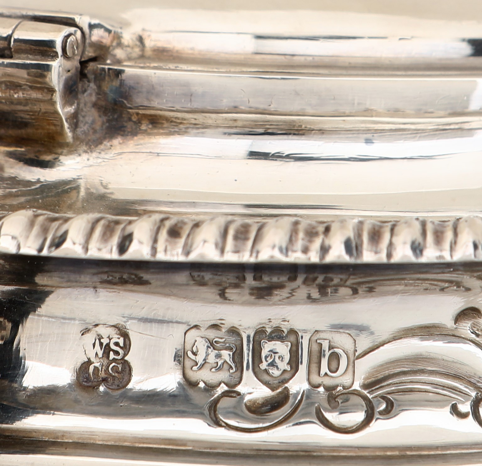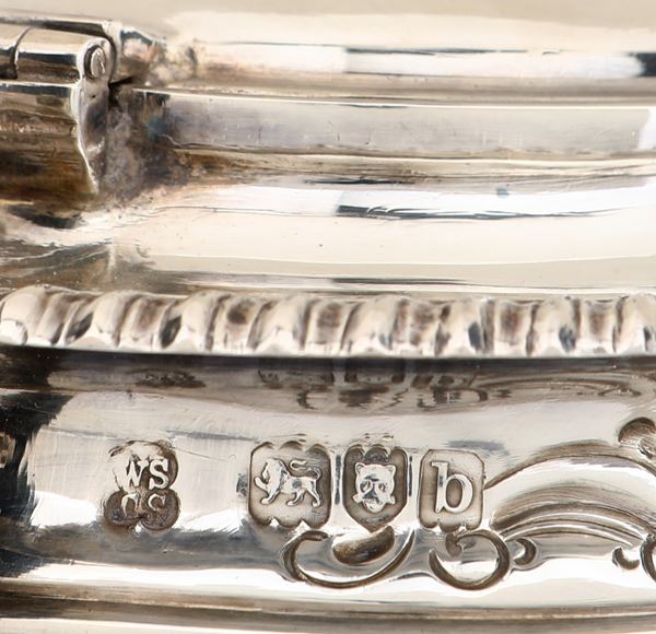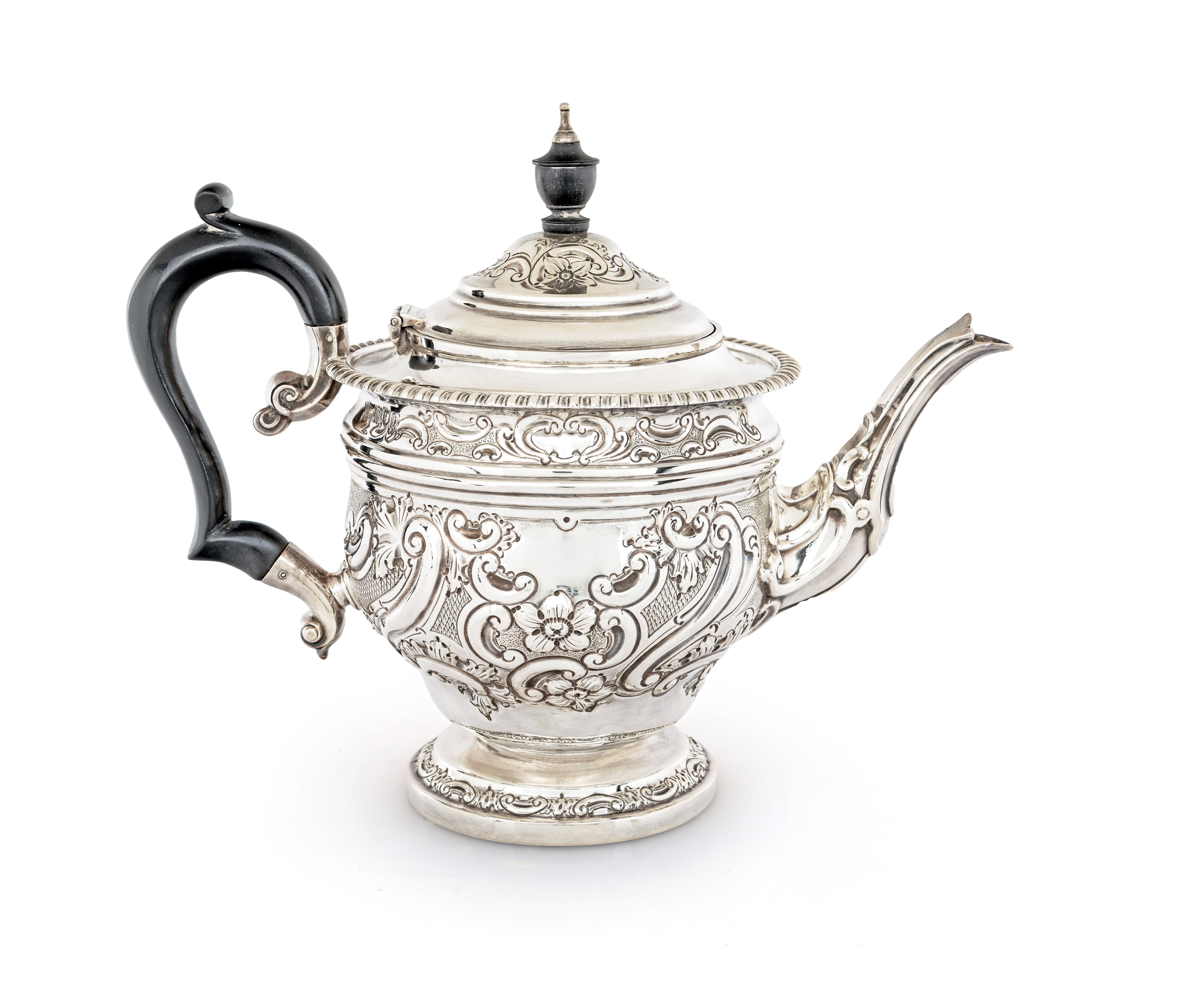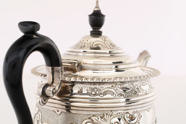 decorazione sbalzata a volute, cartigli e fiori di gusto barocco; la teiera con versatoio sagomato, pomolo e manico in legno ebanizzato