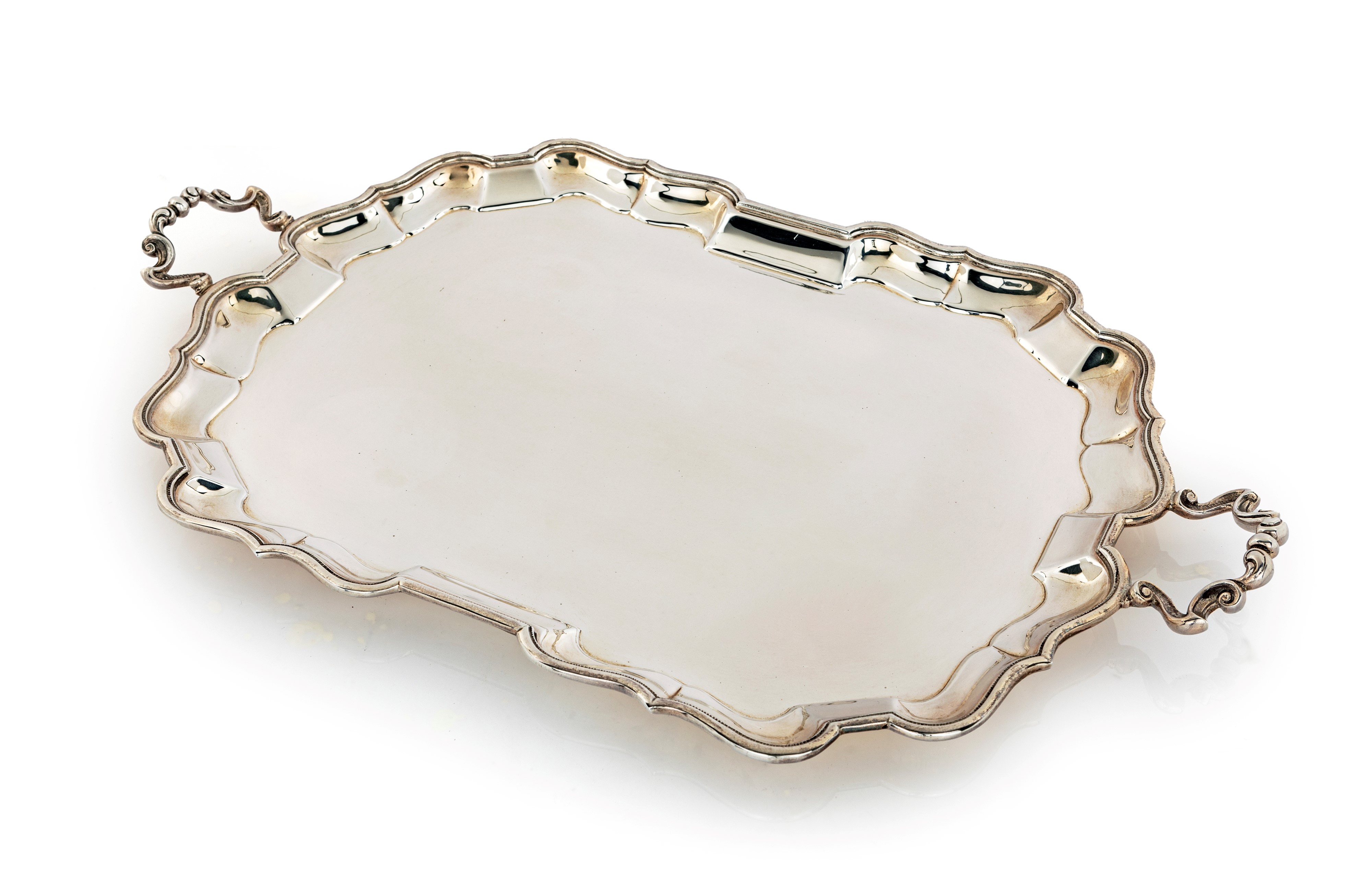 Vassoio sagomato in argento 925/000 con manici, argentiere Enrico Messulam Milano per Bottega dell'Argento
