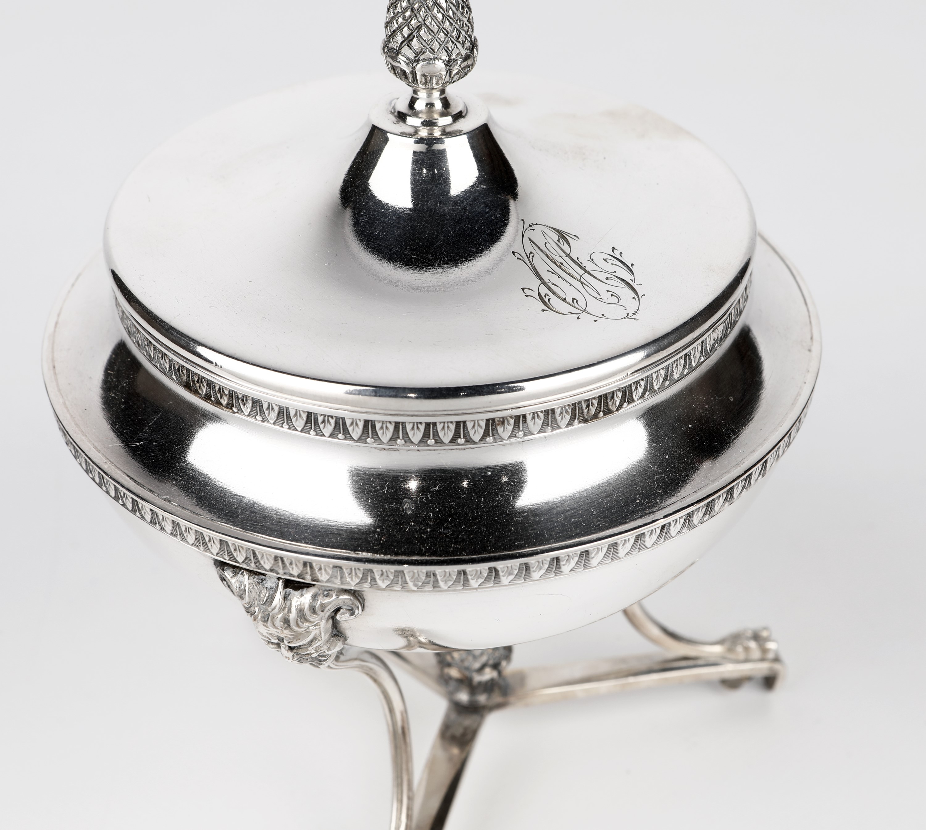 a forma di coppa circolare con profili cesellati a palmette, sostenuta da tre montanti incurvati con teste di satiro all'attaccatura ed estremità inferiore a zoccolo, poggianti su traversa sormontata da una pigna, elemento distintivo ripreso sulla sommità del coperchio personalizzato da monogramma